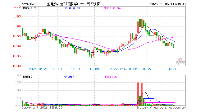 2月6日,截止午间收盘,金融科技ETF鹏华(563670)跌0.22%,报0.908元,成交额76.70万元。金融科技ETF鹏华(563670)重仓股方面,东方财富截止午盘跌0.52%,同花顺跌0.84%,指南针跌0.32%,恒生电子跌0.27%,润和软件涨0.02%,东华软件涨0.32%,新大陆涨0.60%,广电运通涨0.39%,银之杰跌0.55%,四方精创涨2.91%。