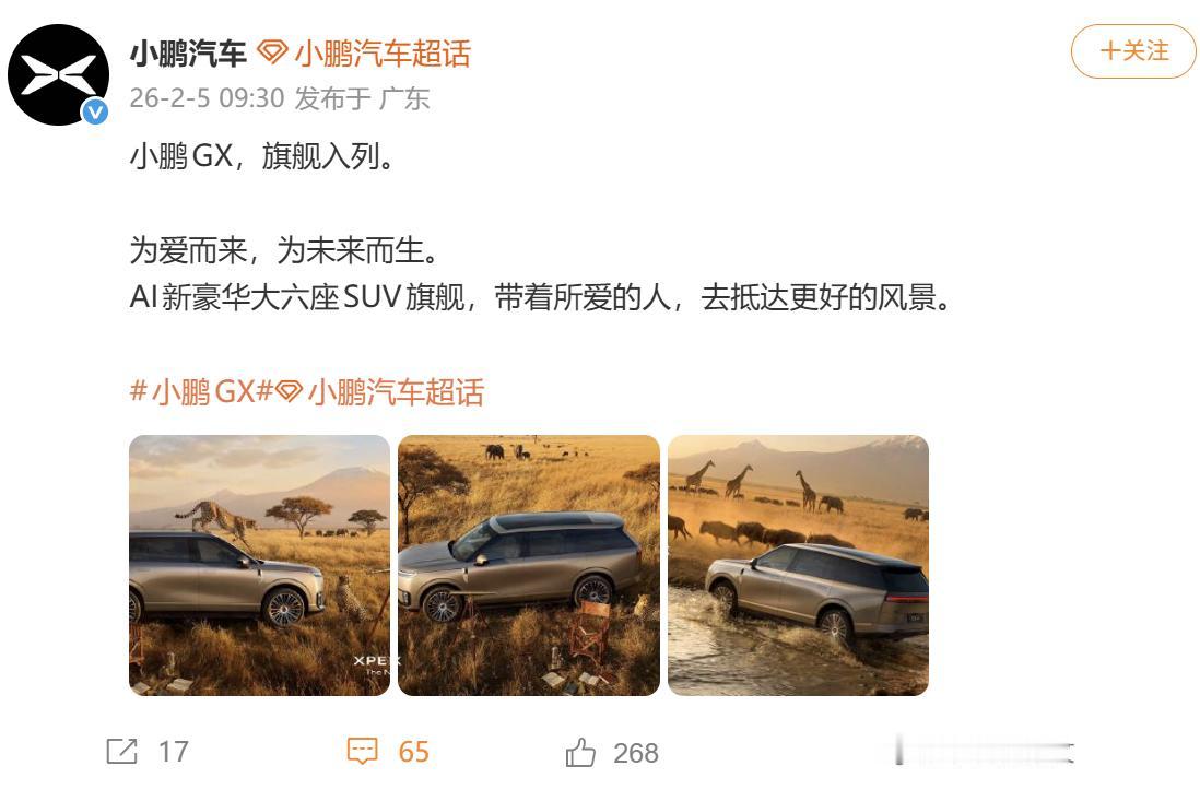 小鹏全新旗舰SUV小鹏GX官宣! 2月5日,小鹏汽车发布全新旗舰SUV小鹏GX官图,新车基于SEPA 3.0物理AI整车架构打造,定位AI新豪华大六座SUV,搭载线控转向和后轮转向的AI底盘。何小鹏称新车研发代号G01,意在以AI思维重新设计全尺寸家用旗舰SUV,解决当前三排座SUV舒适、空间、操控不可兼得的问题。目前内饰和动力细节未公布,但预计将提供纯电和增程版本。小鹏GX官宣