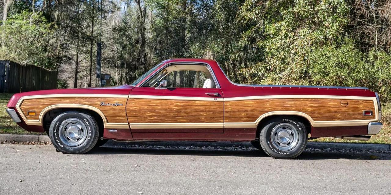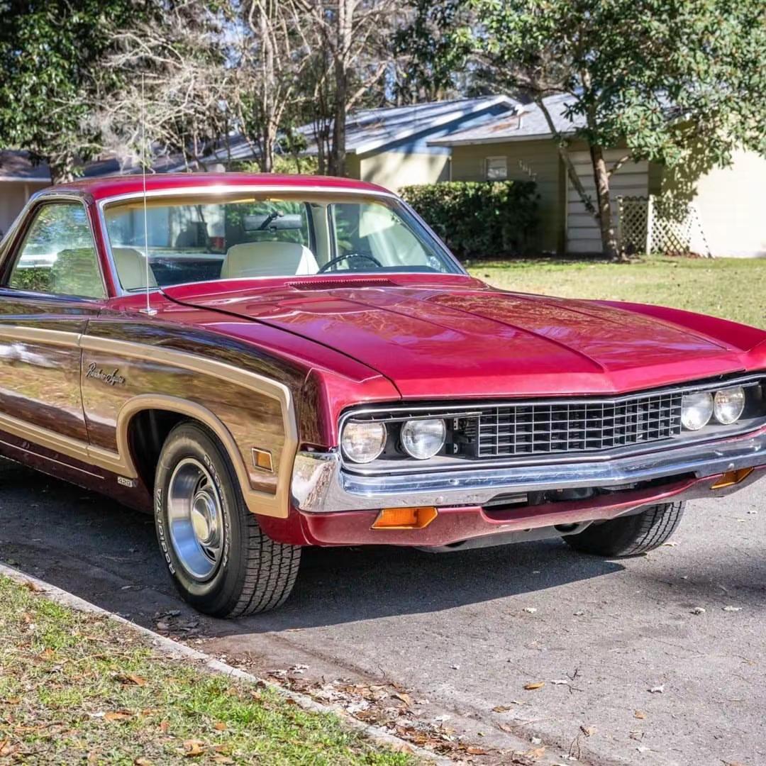 1971年 Ford Ranchero Squire 上市,作为第五代Ranchero中的顶级装饰款,以仿木纹“Squire”车身饰板复制乡村旅行车气质,却把功能性留在了货斗上——既有庄重的外观礼仪,也保留了美式轻型货车的实用基因。 车身尺码接近美式大车的体量:轴距约114英寸,车长约206.2英寸,整备质量在约3,100–3,300磅区间(视配置而定),外观线条在70年代的肌肉美学与实用主义之间取得了耐人寻味的平衡。 动力选择很丰富:可搭配从小排量V8到传奇的7.0升429 Cobra Jet大排量引擎(可达约370马力)的多种动力总成,使得Squire既能胜任家用与载货,也能在需要时展示出强烈的直线加速感。 把一辆能拉货的车打扮成“会穿礼服的汉子”,正是1971年美国文化的缩影:消费走向细分、身份以物件表达。Ranchero Squire 不只是交通工具,它是那个时代对“务实却不放弃体面”的一次浪漫妥协——在铺着仿木纹的后斗里,你既能载一箱啤酒,也能载着一份体面的自我。福特 知识 这车牛逼不 经典老车 汽车