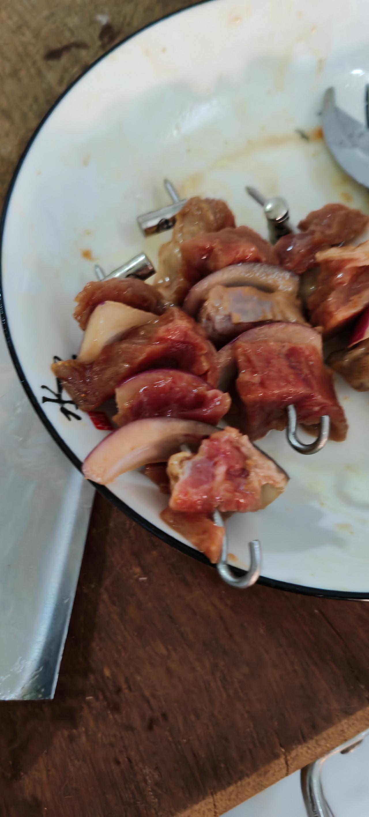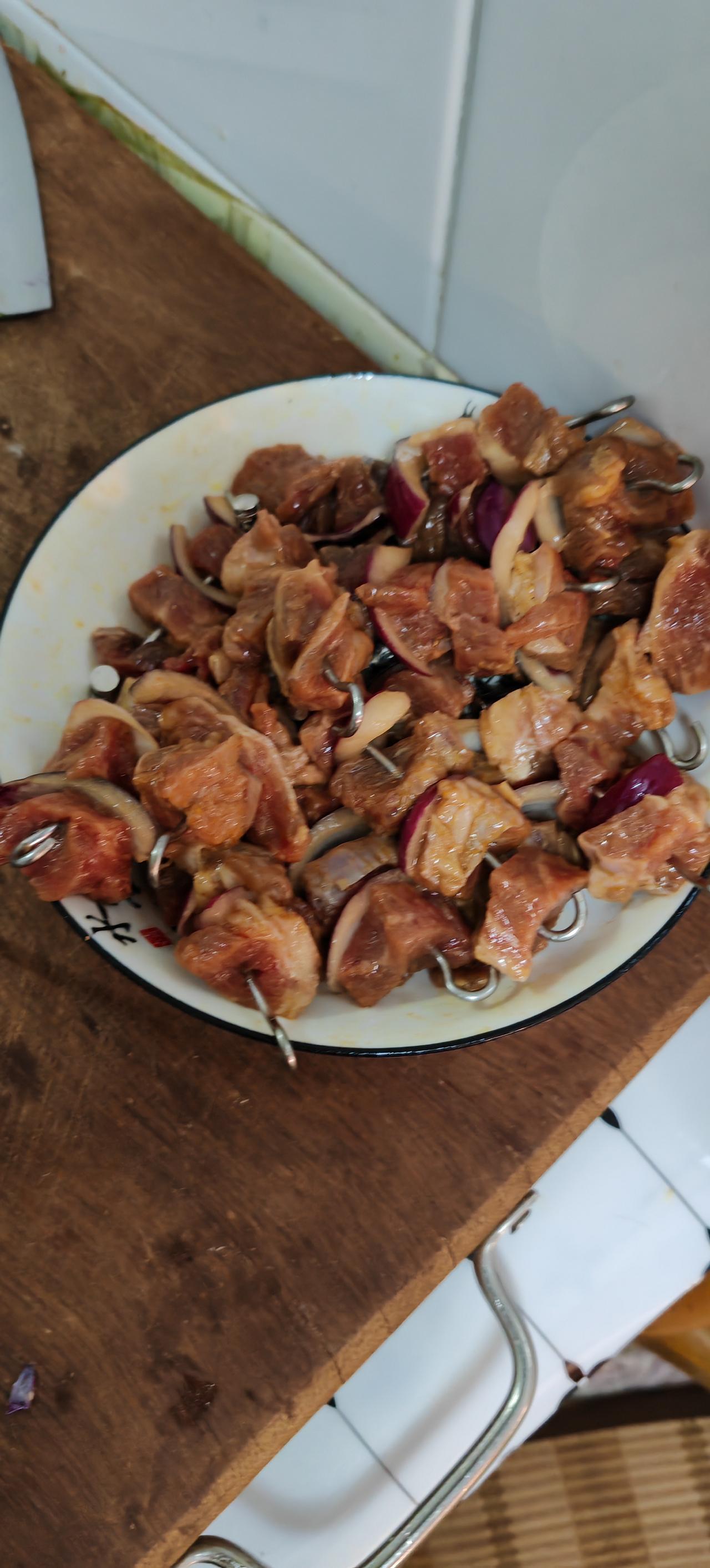 为了迎宝贝回家过年, 老伴儿自制烤串,开启试做试吃~ 道具有网上买的小签子,封存很久的空气炸锅,冰箱的陈年牛肉~ 老伴儿说,练手不能白瞎了新买的和牛肉~ 作为试吃主力的我,不能任性,但可以挑毛病~ 主要有两条,一是时间控制在8—10分钟,拷到12分钟,造成牛肉串干吧了,腮帮子疼;二是没有肥肉,影响口感和品尝感受… 需要她再接再厉吧