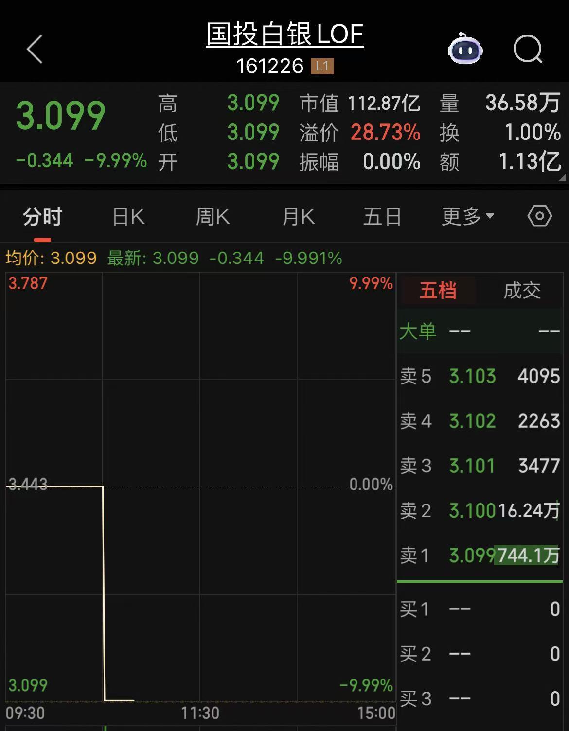 国投白银LOF复牌,毫无疑问的连续第五日跌停,成交额1.11亿元,卖单超744万手,超20亿元。 目前溢价率回落至28.73%。 要是一投资者上周四在二级市场上打板买进,至今已经浮亏超40%。 建议想逃的当天晚上就挂跌停价卖出。(总有勇士接盘的[抠鼻])