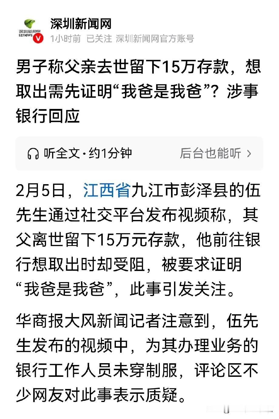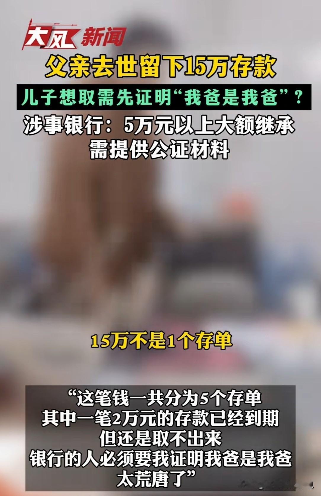 江西九江,男子的父亲不幸离世,留下15万元的存款,因家庭困难,需要这笔钱为老父亲下葬。他拿了那张已到期的2万元存单,以及户口本、亡父火化证、身份证、他本人的身份证,去银行取钱时,一个没穿制服的工作人员称,须做公证,证明“我是我爸的儿子”,不料,银行另有说法! 伍先生的父亲,在2月2日那天离世了,老人在银行留下了15万元存款。 这15万元,对于伍先生这个家庭条件不太好的人家来说,意义重大。 这钱一共分成了5个存单,其中有一笔2万元的存款,刚好到期了。 伍先生寻思着,先把这到期的2万元取出来,给父亲办后事用。 2月5日上午,伍先生带着其他亲属,揣着家里的户口本、亡父的火化证、身份证,还有他自己的身份证,一行人来到某银行。 伍先生满心希望能顺利把钱取出来,因为家里急需用钱,父亲还等着这笔钱下葬。 当时柜台给他办理业务的员工,连制服都没穿。 伍先生心里就犯嘀咕了,这正规吗? 不过当时也没空多想,就想早点把钱取出来,好回家办事。 就他把情况跟工作人员说了,表明自己要取那笔到期的2万元存款。 可工作人员接下来的话,就像一盆冷水,把伍先生浇了个透心凉。 工作人员说,需要公证书证明“我爸是我爸”,不然这钱取不了。 伍先生一听,又急又气,大声说道:“我们带着户口本、我爸的身份证,还有我的身份证,这还不能证明我们的父子关系吗? 可工作人员坚持说不行,这笔钱虽然有2万元到期了,但整体存款超过了5万元。 按照规定,存款金额超5万元,需额外提供继承权公证书方可办理。 也就是说,有了公证材料,才能证明他们的父子关系。 伍先生跟工作人员解释:我们家庭条件不好,老父亲等着这笔钱下葬。 现在去做公证,一来一回得花不少时间,还得花钱,我们实在耗不起啊! 可工作人员只是机械地重复着规定,说这是监管部门的要求,他们也没办法。 家中老人过世,本就是一件伤心的事,如办事再遇到困难,心情可想而知。 伍先生着急的是,父亲遗体还停放在殡仪馆,家里急于用钱办事。 他将当时的视频发布到网上后,引发了人们的关注。 好多网友纷纷质疑银行的做法。 当天下午,记者联系了伍先生,伍先生一肚子苦水没处倒,又跟记者详细说了一遍事情的经过。 他认为,自家老父亲辛苦了一辈子,就留下这么点钱,现在人走了,想取出来给他办后事,咋就这么难呢? 当时他已经带着那么多证件,还不够证明关系吗? 非得让我们去做公证,这不是折腾人吗? 记者为了弄清楚事情的真相,又联系了银行。 工作人员解释,银行对于存款继承是有明确规定的。 如果是5万元以下的小额继承,储户只要提供死亡证明、身份证明、亲属关系证明等材料,我们就可以办理取款业务。 但是存款超过5万元,按照监管部门的要求,就必须得提供公证材料。 当时并没有要求储户证明‘我爸是我爸’,只是按照规定办事。 工作人员认为,伍先生年纪稍大,对相关规定和要求不太了解。 之后,他们家的年轻亲属主动联系银行,工作人员已详细解释了相关规定,对方表示理解。 伍先生听了银行的解释,还是觉得不能接受。 主要是做公证得花钱,又得花时间,他没有多余的精力和钱。 要是实在没办法,也只能硬着头皮去做了,总不能让我爸一直没法下葬吧 他只是想取出父亲留下的那笔钱,给父亲一个体面的葬礼,怎么就这么难呢? 这件事在当地也引起了不小的反响,人们都开始讨论银行的规定是否合理。 有人认为银行的规定是为了保障资金安全,防止冒领和产生家庭纠纷。 假如死者有多位继承人,如上辈老人在世,也有继承权,所以需要公证书确认,合法继承人才能领取逝者存款。 从法律上怎么看待这件事呢? 《关于优化已故存款人小额存款提取有关要求的通知》第一条规定,银行业金融机构应将已故存款人小额存款免公证提取限额统一提高至5万。 该规定允许在一定限额内,继承人无需办理公证,只需提供死亡证明、亲属关系证明等材料即可取款。 本案中,伍先生父亲的存款总额超过了5万元,按照规定,银行要求其提供继承权公证书才能取款,是符合相关规定的。 然而,从伍先生的角度看,他急于取出2万元为父亲下葬。 家庭困难又难以承担公证的时间和费用成本,会觉得银行规定过于死板。 有人支持银行的做法,存款已属于遗产,涉及到继承权的问题,不再是一个人的钱了。 有人反对:继承那是人家家里的事,跟银行有毛关系? 人家分不均自会去打官司,要你银行来做裁判? 记住银行的身份,只是负责保管好人家的钱。 目前,伍先生称,父亲遗体还停放在殡仪馆,还等着急用钱。 关于网友对“工作人员未穿工装”的质疑。 银行回应称,涉事工作人员为新员工,工作服尚未发放到位,并非网友揣测的“外包”情况。 对此你怎么看? 关注@赵哥的法律观