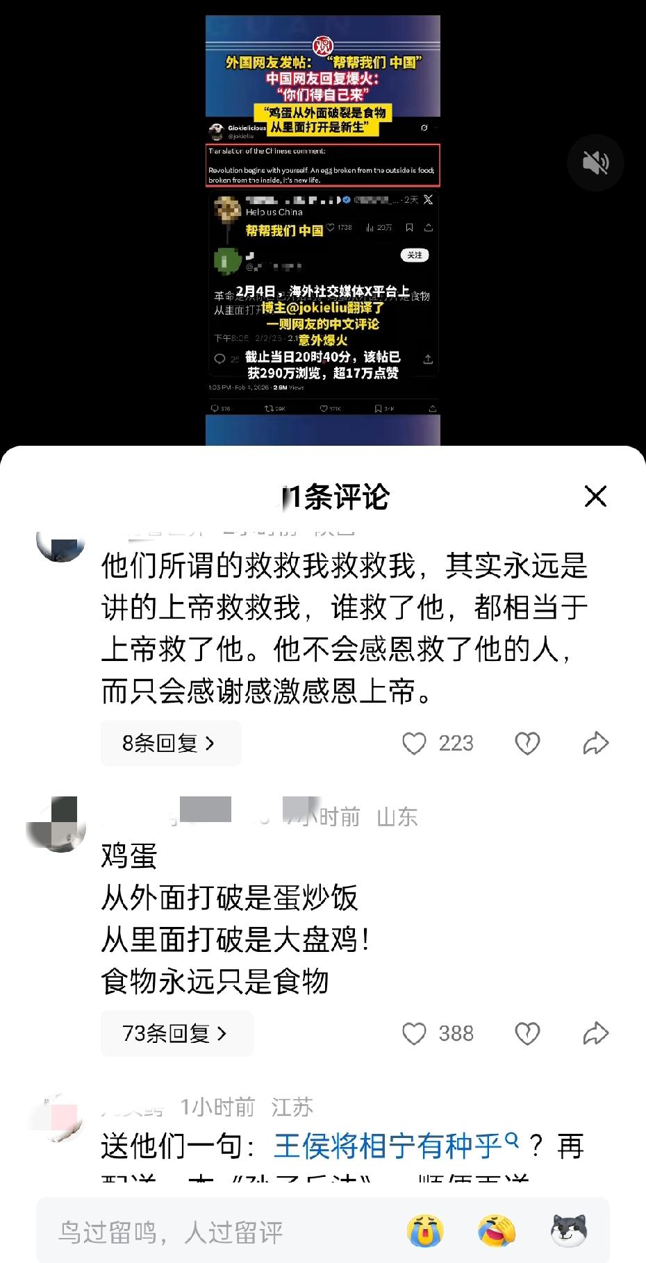 外国网友发帖:“帮帮我们,中国”,中国 网友回复爆火:“你们得自己来”,“鸡蛋 从外面破裂是食物,从里面打开是新生” 中国网友的回怼,直接戳中爽点 就两句回复,直接火遍全网,嘴角压都压不住! 一句“你们得自己来”,一句“鸡蛋从外破是食物,从内破是新生”。 (我看完直接拍大腿,比抢着年货大礼包还开心) 这话真的说到心坎里了,啥事儿都得靠自己。 外人再帮,也扶不起只想躺平的烂泥,这理儿万年不变。 (就像咱过日子,指望别人接济,不如自己撸起袖子干) 这事儿放咱身边,简直是一模一样 咱小区就有那户人家,纯纯的伸手党,啥事儿都找邻居。 水管漏了喊老王,灯泡坏了喊李姐,连买个菜都想让人捎带。 (关键是还不领情,觉得别人帮他是应该的,气人不)