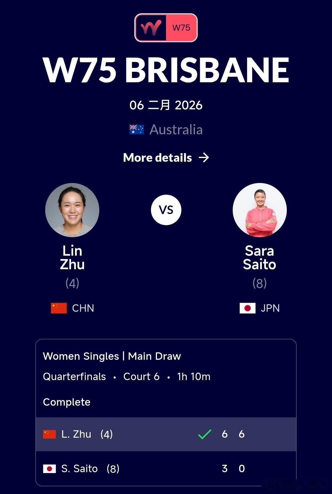 W75布里斯班站🇦🇺女单第8进4朱琳🇨🇳6-3/6-0战胜斋藤笑良🇯?