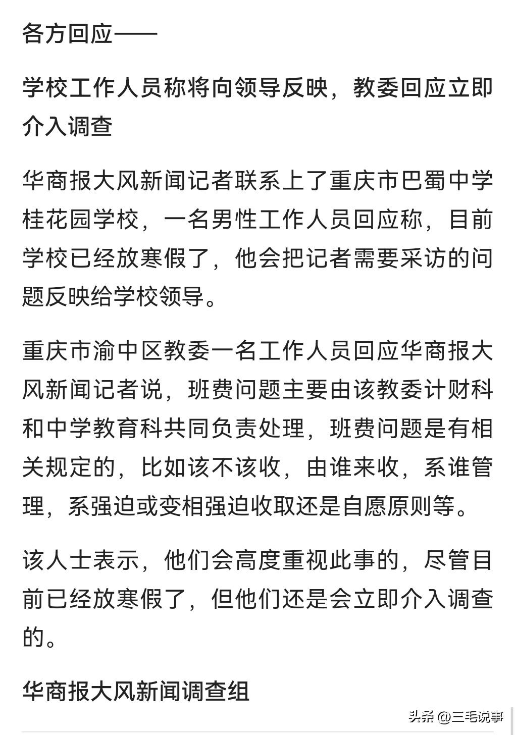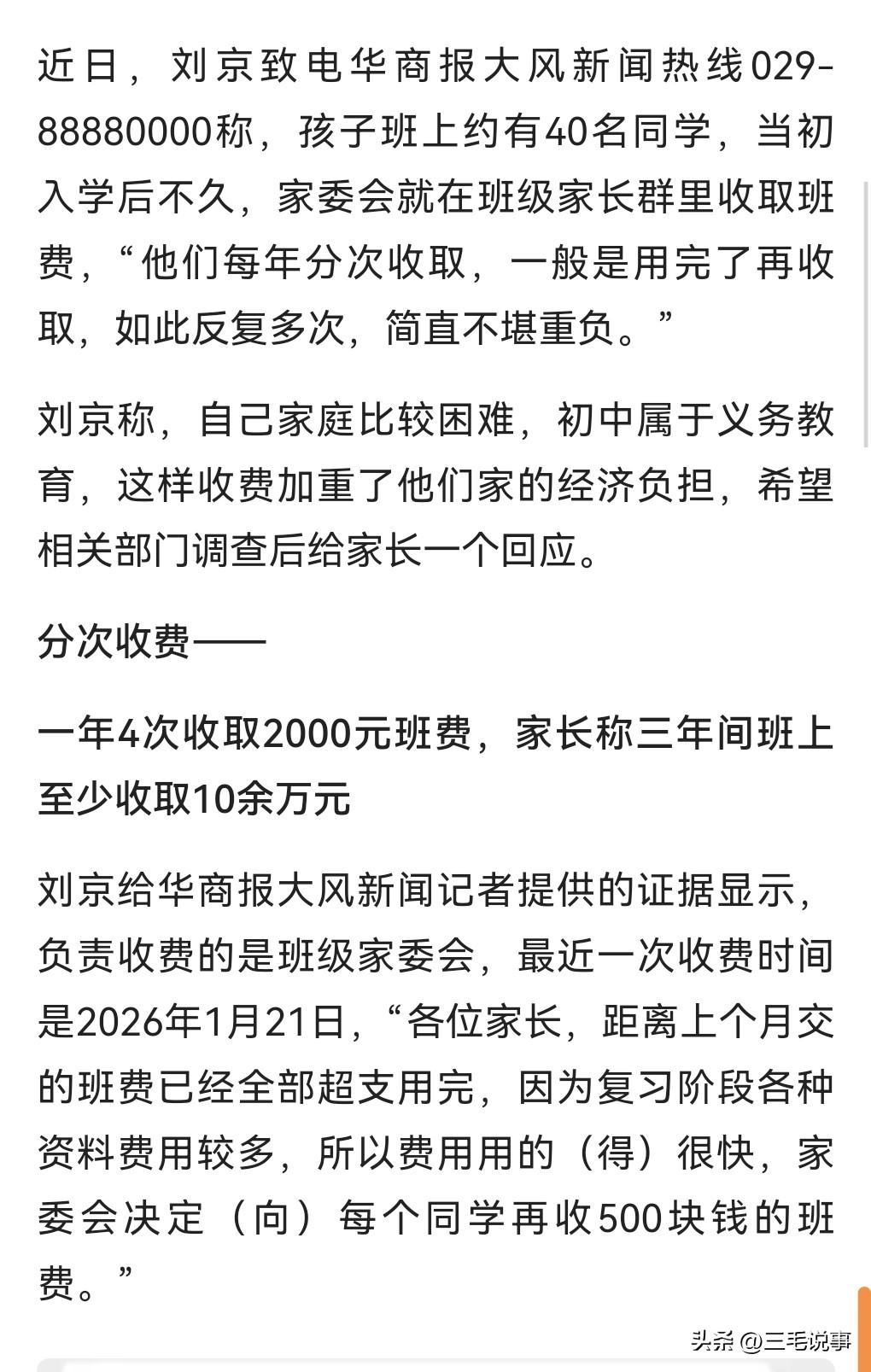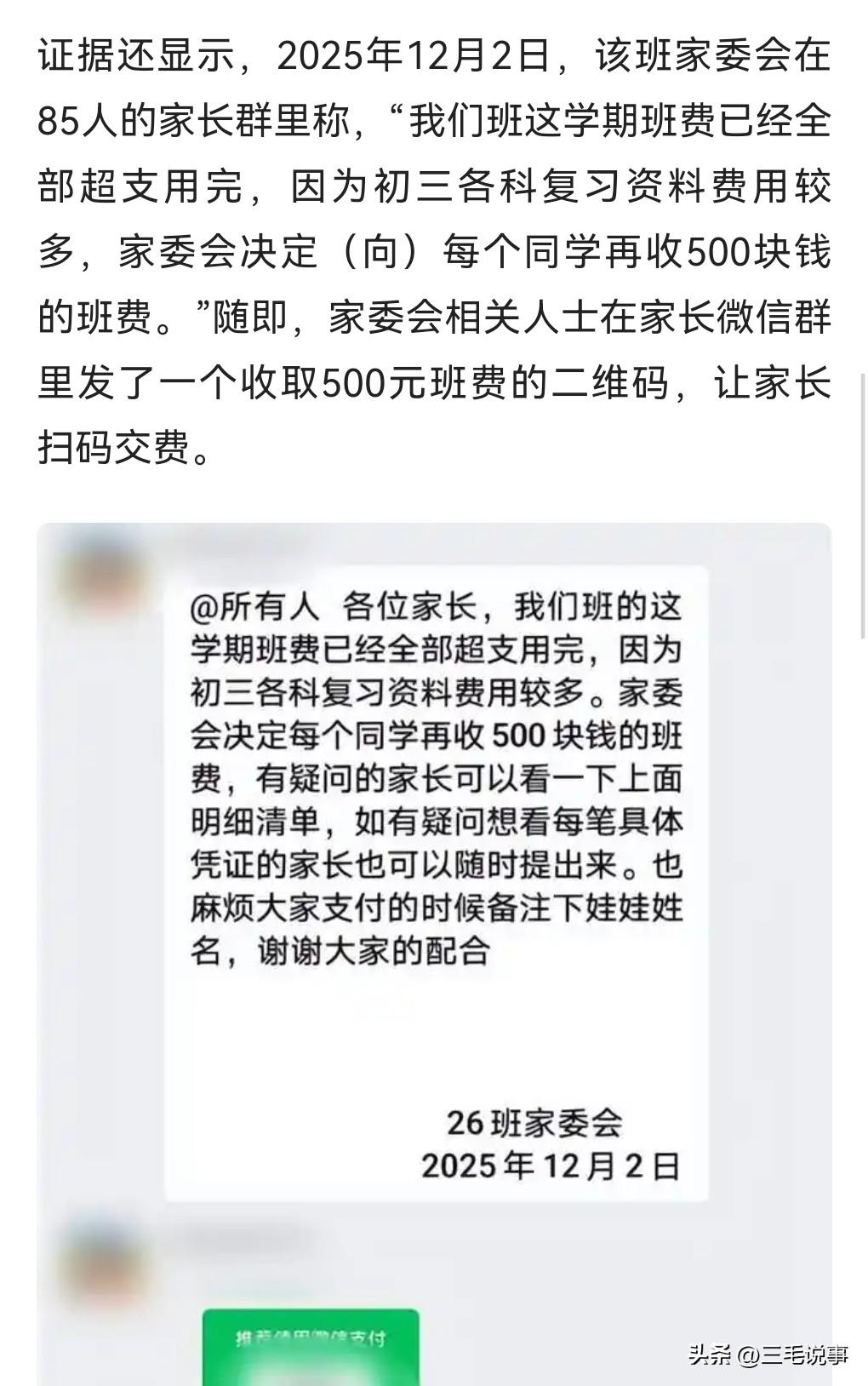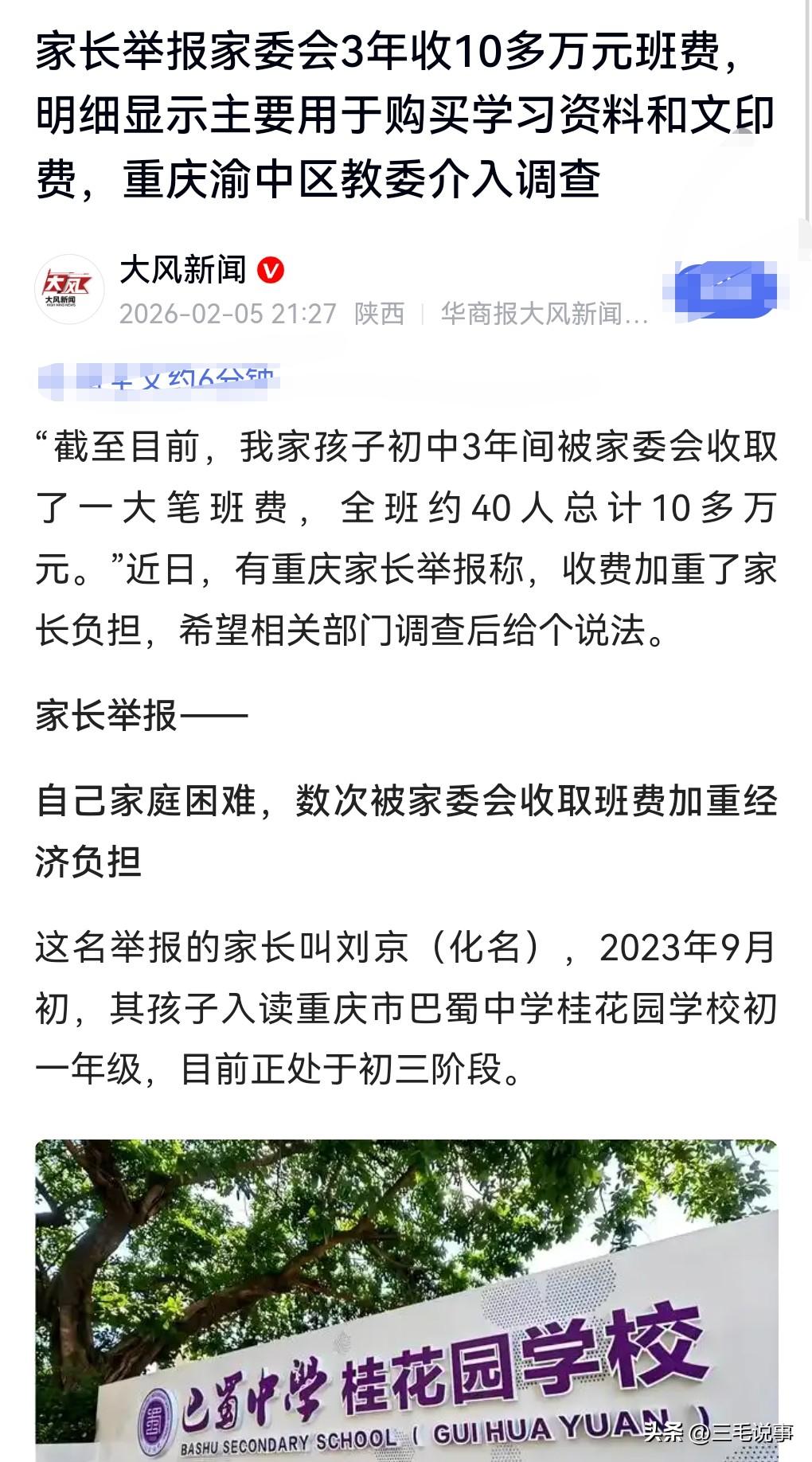 现在这年头出现了一个什么家委会的组织,而且一旦涉及到要收什么班费,要收钱的事情。家委会就会在群里面发二维码收款。 近日重庆,一家长举报家委会3年收10多万元班费。 收了这么多的钱,那要好好的查查。 谁也不愿意动不动就被输钱吧,说什么买什么所谓的学习资料,买那么多干什么,做得过来吗? 班上约40个孩子,这位家长估计三年收了10多万。 问题是这钱是不是全都花在买学习资料上了。 有必要买这么多吗?做得过来吗? 学习是自己的事,什么时候出了家委会在这里指手划脚了。 而且收费已经令有的家庭压力倍增了,毕竟又不是人人家里都富裕。 值得彻查。
