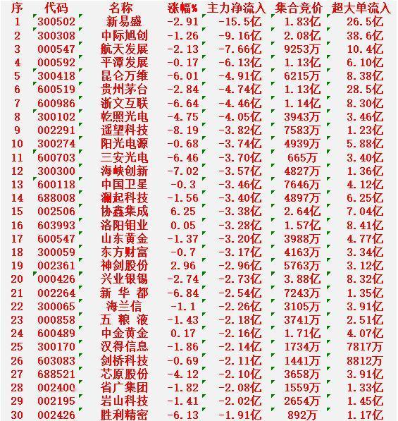 2月6日上午盘,主力趁低位,大幅买入的30名单 五洲新春:涨幅 +10.01%(涨停),净流入 10.3亿元 天际股份:涨幅 +9.99%(接近涨停),净流入 9.47亿元 湖南黄金:涨幅 +10.00%(涨停),净流入 7.14亿元 胜宏科技:涨幅 +3.85%,净流入 6.91亿元 宁德时代:涨幅 +2.13%,净流入 6.74亿元 2月5日中午收盘,主力资金“大幅卖出”的30名单: 新易盛:跌幅 -2.91%,净流出 15.5亿元 中际旭创:跌幅 -1.26%,净流出 9.16亿元 航天发展:跌幅 -2.13%,净流出 7.66亿元 平潭发展:跌幅 -0.17%,净流出 6.13亿元 昆仑万维:跌幅 -6.01%,净流出 4.91亿元