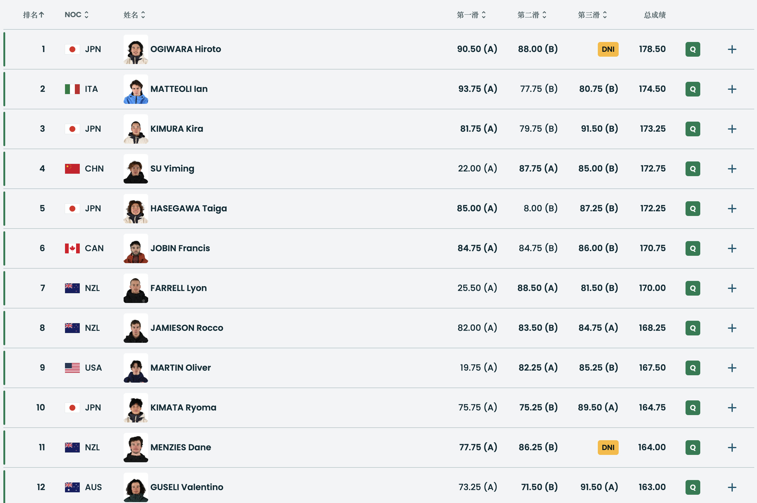 苏翊鸣大跳台晋级决赛米兰冬奥会单板滑雪大跳台 在北京时间凌晨结束的米兰冬奥会男子单板大跳台预赛中,作为卫冕冠军出战的苏翊鸣在首跳失误的压力下,第二跳第三跳出色完成,并且第三跳完成了冬奥首个1980的动作,总分172.5以第四名的成绩晋级决赛。本次男子单板大跳台预算有9人完成了1980的动作,并且决赛入场分高达163分,创下历史记录。决赛将于北京时间2月8日凌晨2点30分进行。