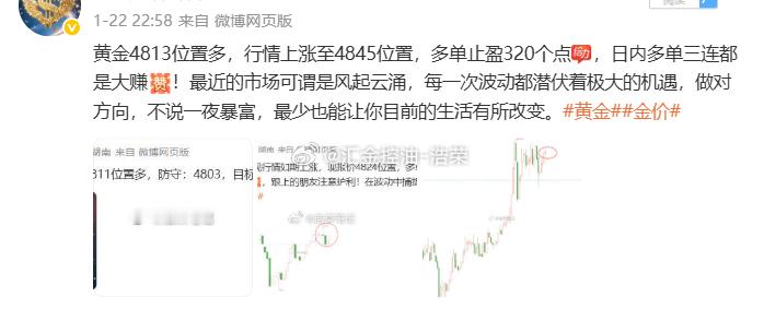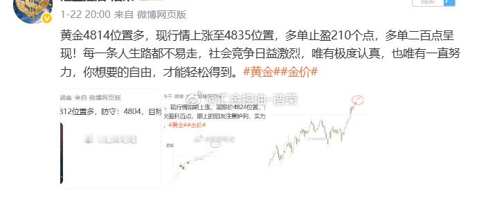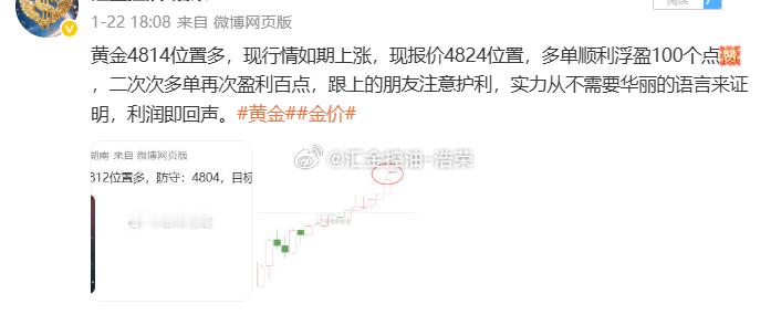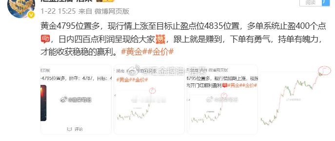 2026.1.22日博文3单,全胜!共收割930个点。行情在犹豫,我们不跟着情绪跑,严格执行计划,稳定输出的观点,步步为营才是真功夫,没有一夜暴富,但有日积月累的确定性!黄金 金价