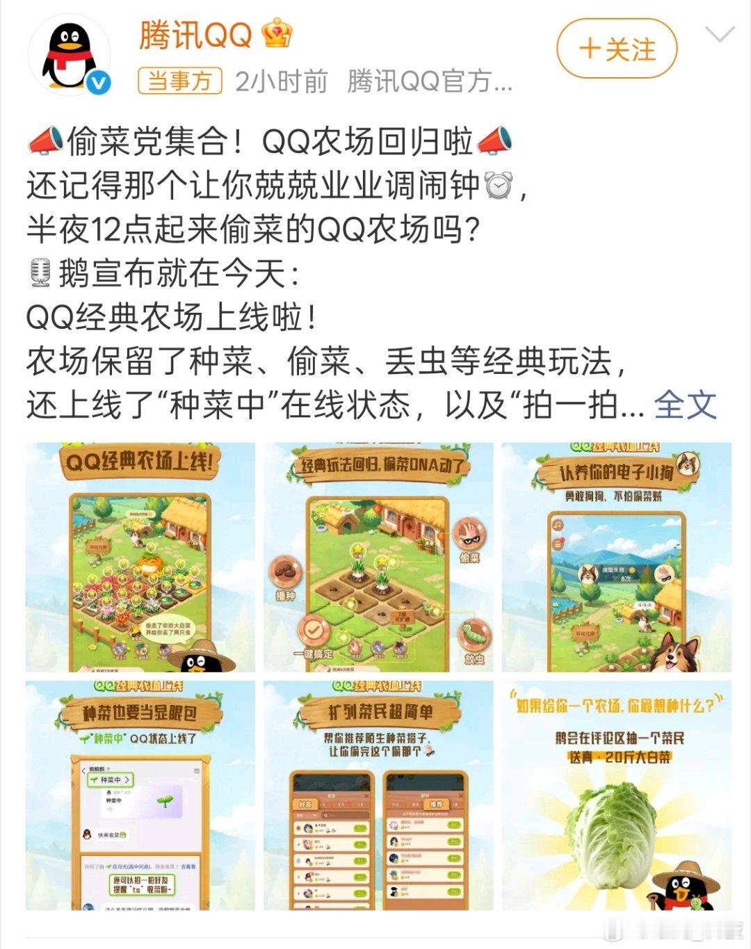 QQ农场宣布正式回归 曾经日夜奋战的QQ农场又要回来了。我刚用手机看了一下怎么重