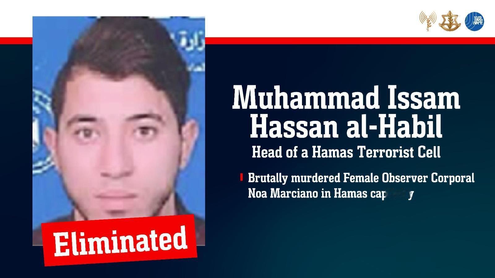 2月5日,以色列国防军和以安全局联合宣布,在加沙城沙提难民营的一次精准空袭中,成功消灭了哈马斯指挥官穆罕默德·伊萨姆·哈桑·哈比尔。该恐怖分子于2023年10月7日哈马斯恐怖袭击期间残酷杀害了被俘的以色列国防军下士诺亚·马西亚诺。