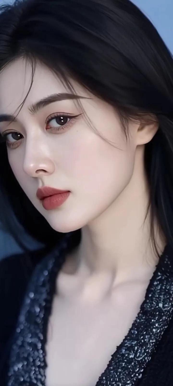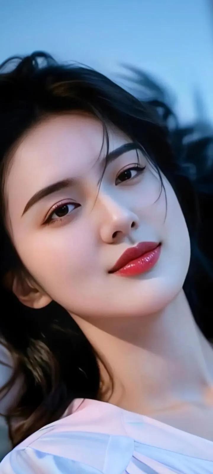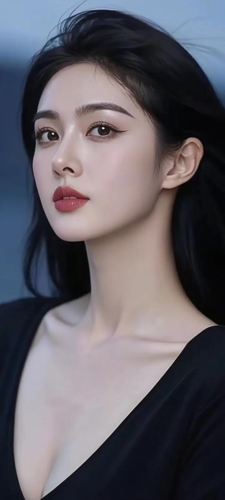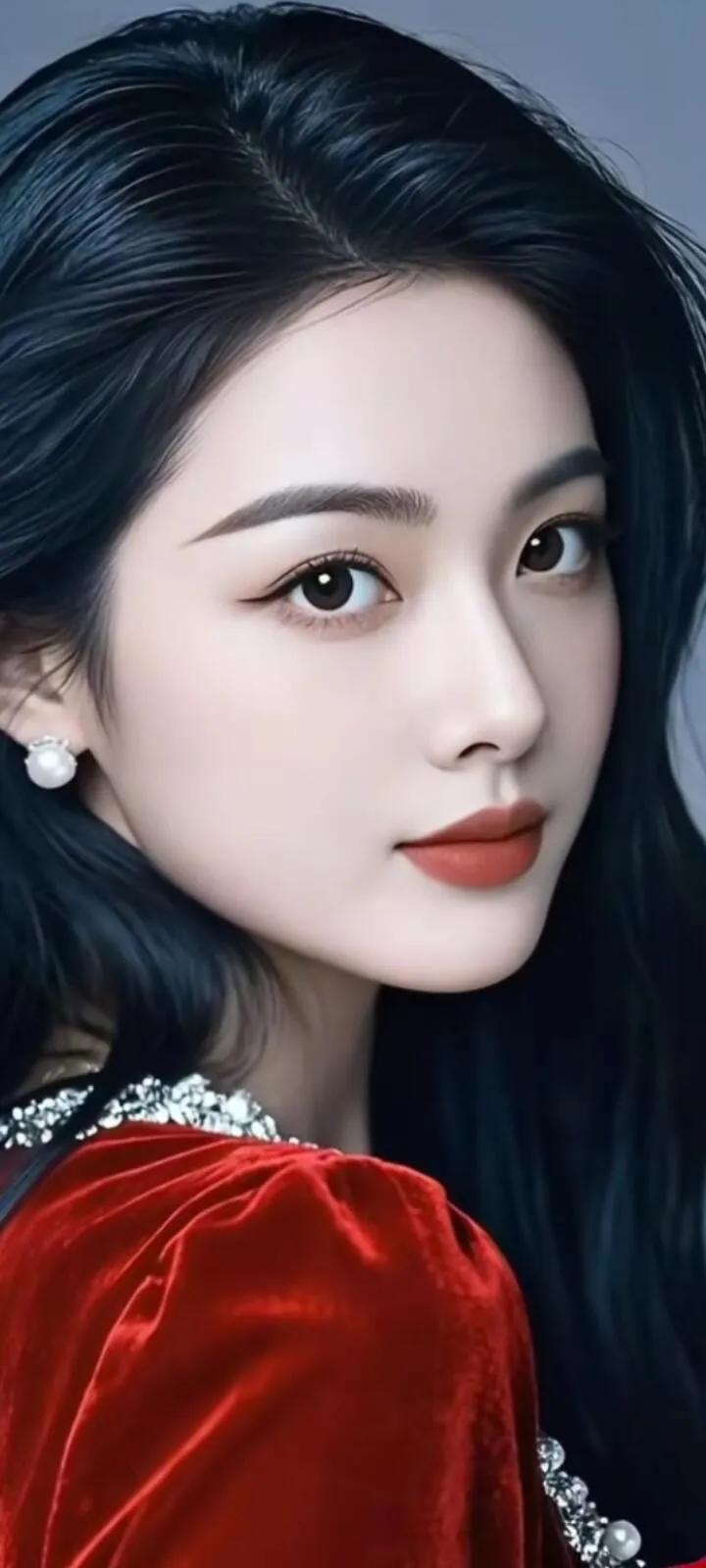 温柔眼波流转,黑发如瀑,红唇轻启,优雅动人。
