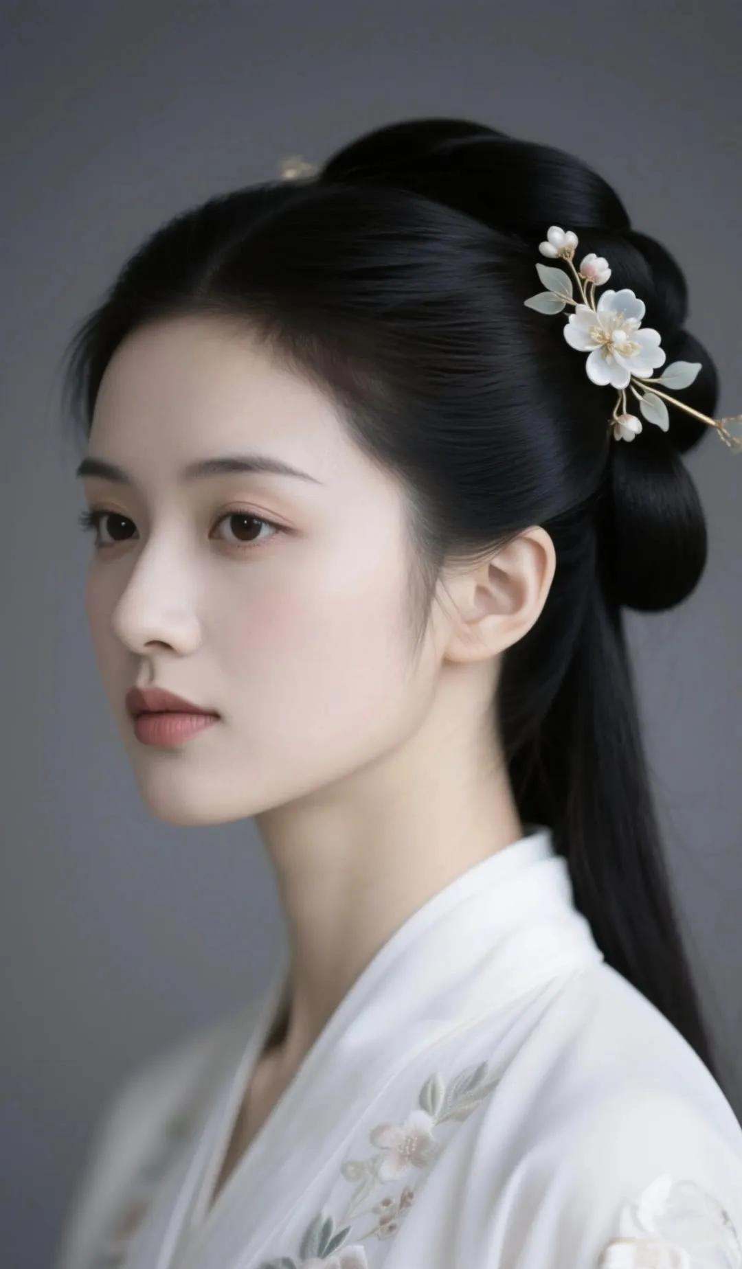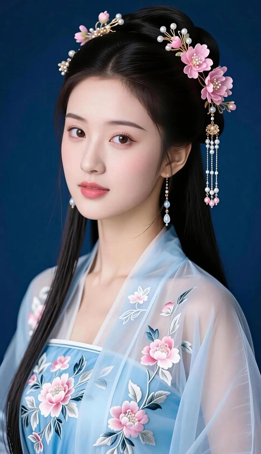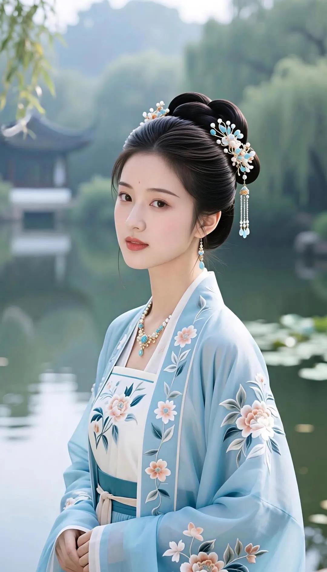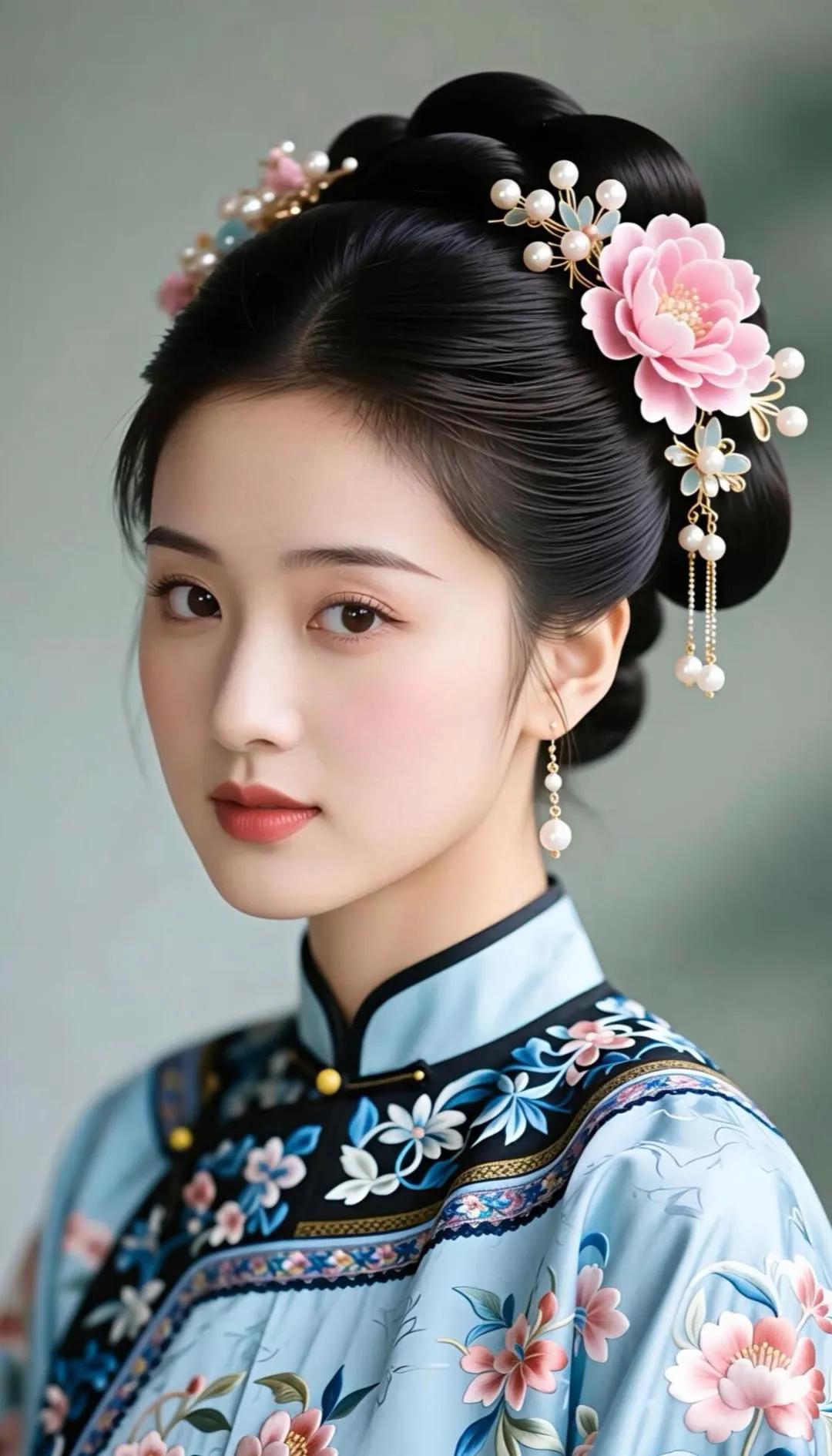 古典美人,花簪垂耳,蓝衣映花,韵味十足。