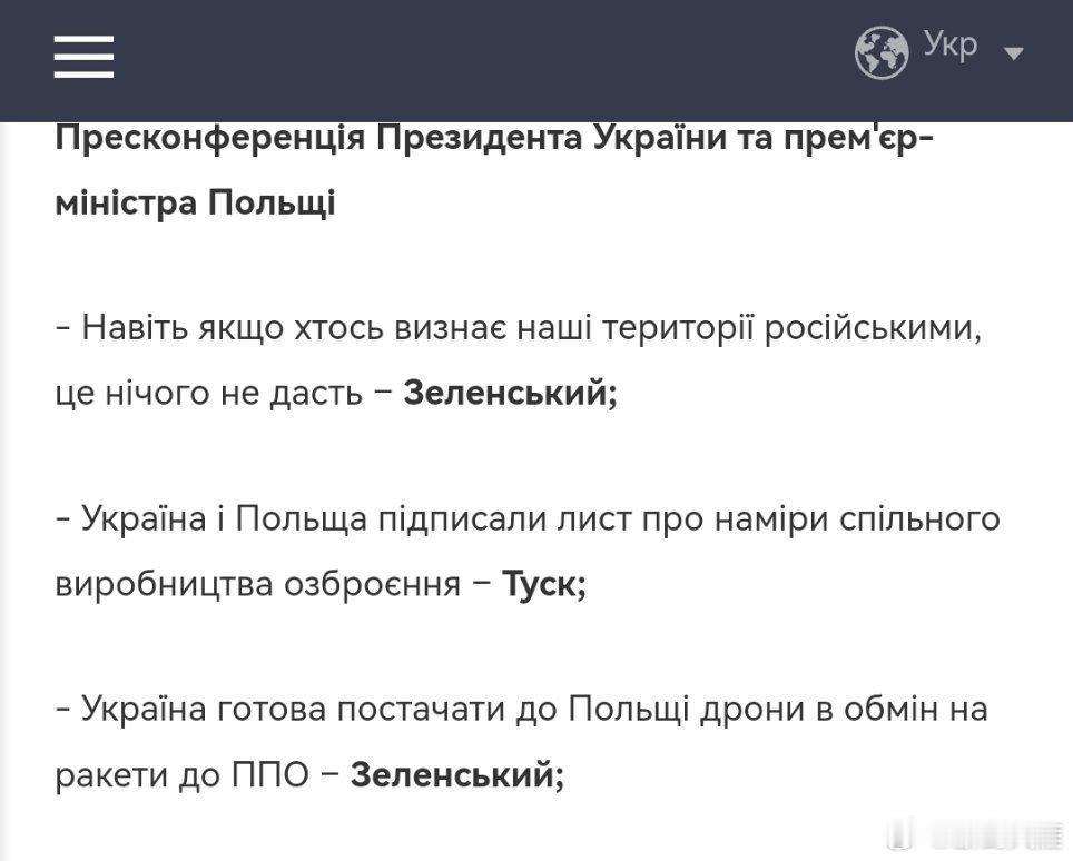 - 乌克兰和波兰签署了联合生产武器的意向书——Tusk;