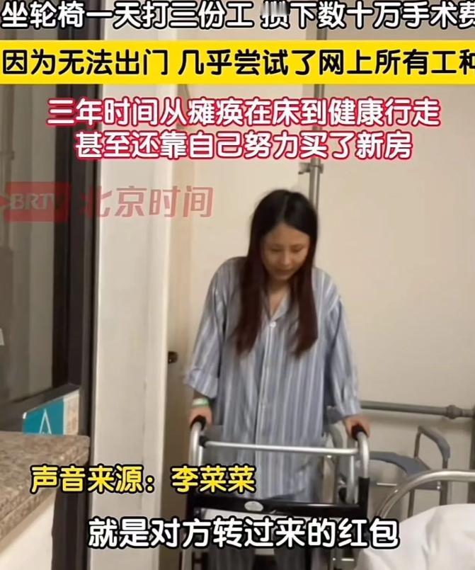 2021年,浙江一95后女子不幸患上骨髓炎,瘫痪在床,向父母求助,谁知,父母竟冷淡地说:“我们哪有能力帮你,你弟还没结婚呢。”然而,女孩并没有放弃自己,为了站起来,她在700个日夜里做了件事,结局却让人泪目。 这名95后女孩叫李菜菜,是浙江台州人,她从小就活在父母的偏心眼里,家里有个小两岁的弟弟,在父母眼里弟弟是宝贝疙瘩,而她就像是个多余的附属品,弟弟感冒发烧,父母立马慌慌张张送医院,挂号买药无微不至,可她就算烧到39度,浑身滚烫站都站不稳,也只能自己拖着虚弱的身子倒水吃药,连一句关心的话都得不到。 小时候的菜菜不懂,为什么同样是亲生的,待遇差别这么大,直到后来她才慢慢明白,在重男轻女的父母眼里,女儿迟早要嫁出去,是外人,而儿子才是家里的根,是要传宗接代、养老送终的,所以哪怕她学习再努力,成绩稳居班级前列,父母也只会泼冷水:女孩子读那么多书有什么用,不如把钱省下来,以后给你弟弟买房娶媳妇。 没人疼就自己疼自己,没人撑腰就自己努力站稳脚跟,李菜菜憋着一股劲,靠着勤工俭学读完了大学,2018年毕业後,找了一份电商相关的工作,勤勤恳恳、节衣缩食,只用了3年时间,就攒下了15万存款,那时候的她满心都是憧憬,想着再努力几年,就买一套属于自己的小房子,彻底摆脱那个冰冷的家。 可命运就是这么残酷,就在李菜菜对未来充满期待的时候,意外悄然而至,2021年9月菜菜突然开始高烧不退,全身疼痛难忍,起初只是偶尔疼一下,后来疼得连路都走不了,甚至晚上都睡不着觉,她赶紧去医院检查,当医生说出骨髓炎这三个字时,菜菜的天,彻底塌了。 医生明确告诉李菜菜,这种病必须尽快治疗,否则很可能要截肢,菜菜不敢耽误,立马辞了工作住院,可骨髓炎的治疗费用高得惊人,她攒下的15万,没几个月就花得一干二净,走投无路之下李菜菜先想到了自己相爱多年的男友,想着两人感情一直很好,他一定会陪自己共渡难关。 可让李菜菜万万没想到,当男友得知她可能一辈子要瘫痪在床、需要人照顾时,连一句安慰的话都没有,直接挂了电话,随后发来一条消息:我们还是算了吧,多年的感情在现实面前脆弱得不堪一击,男友的分手,让菜菜陷入了更深的绝望,但她还是抱着最后一丝希望,拨通了父母的电话。 李菜菜放下所有尊严,带着哭腔恳求父母,能不能借她一点钱治病,还保证以后赚钱了一定还,一定会好好孝敬他们,可电话那头,母亲的语气冰冷得像寒冬的雪:治这种病要花多少钱,还不一定能治好,纯粹浪费钱,我们的钱要留着给你弟弟买婚房、娶媳妇,你自己想办法吧别来拖累我们。 那一刻菜菜所有的希望都破灭了,她终于明白有些亲情,从一开始就是假的,有些依靠从来都靠不住,但她没有选择认命,反而被这接二连三的打击,激起了骨子里的韧劲,你们不帮我,我自己帮自己,你们看不起我,我偏要活得比谁都好。 为了赚钱治病菜菜给自己办了残疾证,坐着轮椅开启了连轴转的生活,她一天打三份工,每天工作长达16个小时,忙得像个停不下来的陀螺,早上天不亮,别人还在睡梦中,她就坐着轮椅去便利店当收银员,下午回到家来不及休息,就坐在电脑前接单写文案、做视频剪辑,晚上别人都在休闲娱乐,她还在熬夜打理自己的网店,经常一天只能睡四五个小时。 身体的疼痛无时无刻不在折磨着她,有时候疼得浑身发抖,菜菜就咬着毛巾硬扛,哪怕汗水浸湿了衣服,也从来没有想过放弃,骨髓炎的治疗很漫长,这期间她先后做了四次手术,每次手术前都是她自己颤抖着签下手术同意书,偌大的医院里,从来没有一个人陪在她身边。 就这样在700多个日夜的煎熬里,菜菜靠着超乎常人的毅力,硬生生攒下了38万手术费,而她要面临的第五次手术,成功率只有25%,赌赢了就能重新站起来,赌输了就要一辈子在轮椅上度过,面对医生的提醒,菜菜没有丝毫犹豫,笑着说:失败了也没关系,不过是比现在难一点点我不怕。 也许是李菜菜的坚韧感动了上天,这场赌上一辈子的手术,竟然成功了,2023年27岁的菜菜,在手术后18天,终于重新站了起来,一个月后她彻底扔掉了轮椅,重新学会了走路,那一刻所有的心酸和委屈都有了归宿。 重生后的菜菜,并没有沉溺于自己的幸福,也没有选择报复那些伤害过她的人,她出版了自传,写下自己的经历,还主动帮助和她一样深陷困境的残障群体。 2025年李菜菜靠着自己的努力,在杭州买下了一套属于自己的房子,还计划把房子改成“残疾人互助空间”,给那些无人撑腰的人,点亮一盏前行的灯。 后来她的父母得知她过得越来越好,竟然主动找上门来,声称是他们养育了她,要求她报答养育之恩,菜菜只是平静地拒绝了,还改名叫李彩彩,她要和过去的自己告别,和那个冰冷的家告别。 麻烦看官老爷们右上角点击一下“关注”,既方便您进行讨论和分享,又能给您带来不一样的参与感,感谢您的支持!