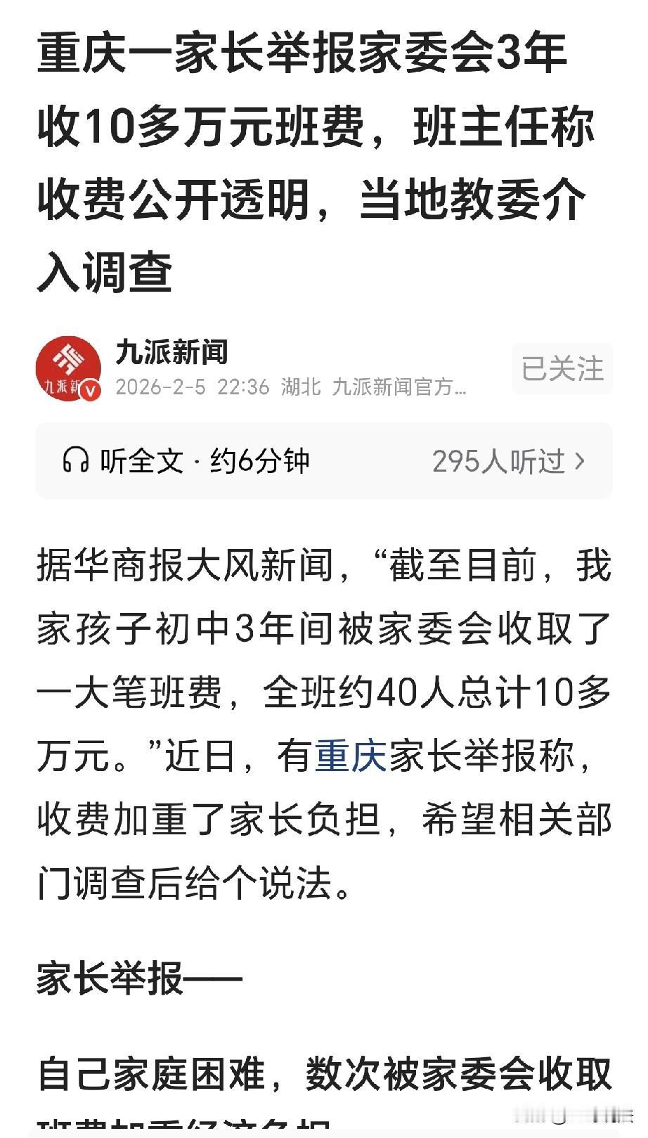 “太难了!”重庆,一家长收到班委会消息: 各位家长,上个月班费用完,家委会决定向每个同学再收500块钱的班费,家长一查,发现孩子初中3年,被家委会收取了一大笔班费,他们分次收取,一年4次,每次500元,收取2000元班费,班上40名学生,总计收取10多万元,家长:我已不堪重负! 刘京最近一肚子火,他的孩子在某学校读初三,从2023年入学到现在,3年时间里,家委会反复收取班费,让本就不宽裕的家庭越发吃力。 2023年9月,刘京的孩子上了初一,孩子长大,刘京非常高兴,希望孩子能好好学习,将来长大比自己出息。 可上了三年,花了他大笔的钱,刘京发现,班委会不断的在收取班费。 记得孩子刚上初一,家委会就开始在群里喊着收班费,说是用完了再收。 一开始他没多想,想着都是为了孩子,也就交了。 可没想到这收费就没停过,光是2025年一年,家委会就收了4次,每次500元,算下来一年交了2000元。 加上前两年的缴费,全班40个孩子,三年下来总计收了10多万元。 刘京翻着手机里的聊天记录,每一次收费的通知都十分扎眼,2025年6月,家委会说班费花完了,要再收500。 到了10月,又说剩下的班费不够用了,继续收取。 他以为这就算完了,可到了12月和2026年1月,都以复习资料花钱多为由,各收了500元。 每次收费,家委会都会甩个二维码在群里,让家长扫码交钱。 家委会会发一些支出明细,大多是买学习资料和文印费。 2025年12月,买的是化学资料《启航》,每本58元; 2026年1月7日,英语资料《高分突破》89元一本,星火英语51.8元。 还有一份表格显示,2025年11月6日,全班共支付数学复习资料《中考总复习》3564元。 11月14日,《高分突破》每人每本80元。 12月1日,全班支付三自主资料费6660.13元。 另外还有两次大额支出,一次是4356元的资料费,一次是4923元的文印费。 刘京觉得,就算花钱,也不该这么频繁地收费,开支是否合理,他在心里打了个问号。 家委会这样收费,刘京负重难行,家里越发的困难,自己的孩子才上初中,这个阶段,明明是义务教育。 刘京认为,这太不合理,他选择举报,希望相关部门能查清楚此事。 随后,记者联系到了刘京孩子的班主任,班主任回应,他从不过问班费的事,只知道是家委会在负责,收费都是自愿的,钱也都花在了孩子身上。 可刘京表示,他家孩子这3年来,总共缴了5000元班费。 可班主任否认: 不可能有那么多,每次都是用完后再收取的。 对于家长们议论最多的文印费,班主任让去问学校文印室。 随后,记者又联系学校,工作人员说正在放寒假,会把情况反映给学校领导的。 教委工作人员则表示,班费收取有明确规定,不管是不是放假,都会马上介入调查。 有人认为,从账单上看,费用支出没问题,而且分摊每学期不到500,这费用很低了,整个班就因一个人的投诉,导致后绪学习资料发放变得麻烦了。 也有人说,无论是学习资料也好,或者其他任何东西,完全都可以自行购买,为什么要通过家委会?家委会有什么权利收钱? 也有网友留言表示,还是统一购买好,要不然每个家长有的买的不一样。 而且家委会集中起来买肯定比自己去外面买便宜,投诉来投诉去最后没人干活了,累的还是自己,钱还花更多了。 看来,各家的情况不一样,家长也有不同意见。 那么,家委会到底有没有权利收费? 《义务教育法》第25条规定:学校不得违反G家规定收取费用,不得以向学生推销或者变相推销商品、服务等方式谋取利益。 也就是说,在义务教育阶段,学校只能按G家和地方明确的项目与标准收费。 额外收费必须有法定依据且经批准,不能巧立名目乱收费用。 学校也不能通过统一购买教辅、文印、校服等“搭车”推销或变相推销商品或者服务赚钱。 哪怕家委会代收,声称都是家长自愿也不行。 家委会不是法定收费主体,学校有监督与管理责任。 家委会如果频繁收费,统一购买教辅,若学校未履行监管义务,甚至默许家委会越权收费,就可能触碰这条规定,这也是教委介入调查的重要法律依据。 有网友表示支持,这家长很勇敢,正义无畏,他争取的光也会照亮了别人,要是多了这样的人,将会进步不少。 对此,你怎么看?欢迎评论区留言讨论。