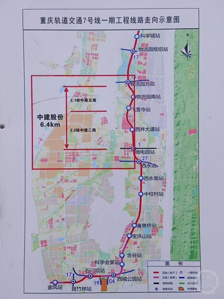 重庆轨道交通7号线一期 重庆轨道交通7号线一期是重庆市西部槽谷地带南北向的骨干线路,7号线一期工程预计2027年建成通车。 线路全长约28公里,起于科学城站,止于金凤站,线路主要沿纵五线、飞雪路、永泰路、科学大道、高新大道、樱桃路敷设,共设车站18座(地下站14座、高架站4座),其中换乘站7座,可与轨道交通1号线、15号线、17号线、19号线、27号线、永川线(C4线)换乘。 全线采用As型地铁列车6辆编组,设计时速100公里/小时,设白市驿车辆段与物流园枢纽主变电所、科学会堂主变电所,总投资约215.7亿元。等它通车,西部槽谷的交通肯定更顺畅,生活也会更便捷。