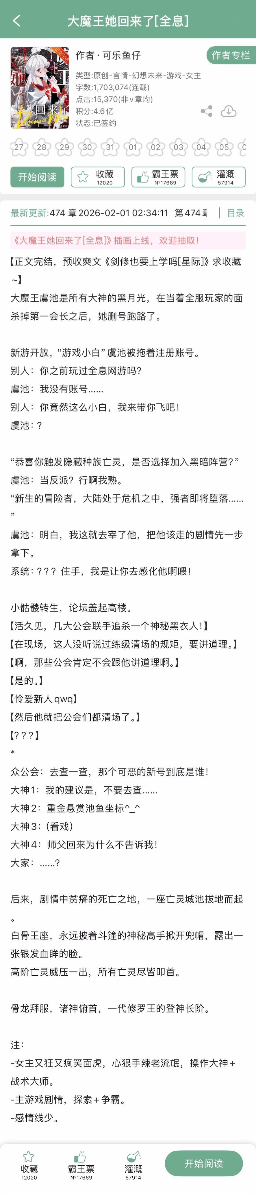 可乐鱼仔的《大魔王她回来了[全息]》完结啦!全息游戏文,女主大佬回到新手村,主剧情~