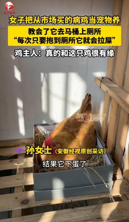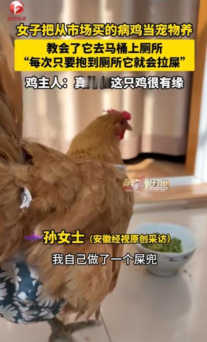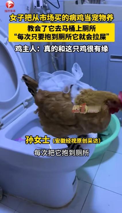万万没有想到,江苏,一女子从市场买到一只病鸡,而治好鸡后女子本打算把它吃了,结果因鸡下蛋了,且还很有亲近人,女子便直接将其当宠物养。更让人没有想到的是,如今这鸡居然还学会了去马桶上厕所,只要女子每次把鸡抱到厕所马桶上,它就会自己主动排便。 谁也没想到,孙女士一次偶然的买鸡经历,竟让人和鸡结下了一段特别的缘分。 孙女士平日里就喜欢买点活禽回家自己打理,总觉得新鲜的食材吃着更放心,那天她像往常一样去家附近的市场逛,想着挑一只土鸡回家炖锅鸡汤,补补身子。 在活禽摊前挑拣的时候,她注意到角落里有一只鸡和别的鸡不一样,别的鸡都活蹦乱跳抢着吃食,这只鸡却蔫蔫地缩在一边,连头都抬不起来,站在那里摇摇晃晃,看着精神头极差。 摊主也直说这只鸡看着不太舒服,怕是养不活,愿意便宜点卖给孙女士。孙女士想着反正价格实惠,就算养不活也亏不了多少,要是能治好的话,刚好能吃,抱着这样的想法,她就把这只病鸡带回了家。 刚到家的时候,这只鸡的状态更差了,不仅不吃不喝,甚至连站都站不稳,就窝在地上一动不动。 孙女士看着这副样子,也没想着直接放弃,她想起老家流传的给病鸡急救的法子,调制一碗补充体力的水,用小勺子一点点喂给鸡喝,先帮它稳住身体状态。 之后又特意跑到附近的农资店,买了适合家禽吃的药,回来按照说明,每天定时定量喂给鸡吃。为了让鸡能好好恢复。 孙女士还特意在阳台给它收拾出一个小笼子,铺了干燥的稻草,既保证了温暖,又留了通风的空隙,每天都会去看看它的状态,添水添食。 就这样精心照料了整整一个星期,这只鸡居然真的慢慢缓了过来,开始主动啄食小米、喝水,原本耷拉的脑袋也能抬起来了,走路也稳当了。 精神头一天比一天好,看着这只被自己救活的鸡,孙女士心里还挺有成就感,想着这下总算能兑现当初的想法,把鸡处理了吃了。 可就在孙女士琢磨着什么时候处理这只鸡的时候,一件意外的事让她彻底改变了想法,那天早上,她像往常一样去阳台看鸡,竟在稻草堆里发现了一枚圆滚滚的小鸡蛋。 不大不小,干干净净地躺在那里,不用想也知道,这是这只鸡下的第一枚蛋。 看着这枚鸡蛋,孙女士的心里一下子软了下来,再想想这阵子的相处,她发现这只鸡格外通人性,也特别亲近人。 孙女士在家走到哪,它就迈着小短腿跟到哪,从客厅到阳台,从厨房到卧室,一步不落,孙女士坐在沙发上休息,它就乖乖蹲在脚边,用小小的脑袋轻轻蹭她的手背,那股黏人的样子,让孙女士彻底舍不得下手了。 索性她就打消了吃鸡肉的念头,决定把这只鸡当成宠物养着,还给它准备了专属的食盆和水碗,每天换着花样给它准备吃食,把它当成了家里的一份子。 养宠的日子虽然温馨,却也有实实在在的小麻烦。鸡是直肠子,有便意了就会随时随地排便,家里的地板、沙发、茶几,时不时就会留下鸡的粪便,每天清理这些污渍成了孙女士的日常,费时又费力。 为了解决这个问题,孙女士还自己动手,用柔软的布料给鸡做了一个简易的屎兜,套在鸡的身上,能暂时接住粪便,减少家里的清洁工作量。 可屎兜毕竟需要频繁更换,时间久了还是不方便。看着家里的马桶,孙女士突然萌生了一个想法,能不能训练这只鸡在马桶上定点排便呢? 孙女士开始细心观察这只鸡的生活习惯,慢慢发现了它排便前的信号,一开始,孙女士赶紧把鸡抱到厕所的马桶上,鸡站在冰凉的马桶圈上,显得格外不安,根本不配合。 如果鸡碰巧在马桶上完成了排便,孙女士就会立刻喂一点它最爱吃的小米粒当奖励,用这种方式给它正向的引导。 就这样日复一日地反复尝试,慢慢的,这只鸡竟然真的形成了条件反射,不用孙女士刻意引导,只要被抱到厕所的马桶上,它就会乖乖地待着,然后主动排便,一点都不会弄到马桶外面,彻底解决了随地排便的问题。 提起这件事,孙女士总是笑着说,每次只要抱到厕所它就会拉屎,特别省心,现在再也不用为清理鸡的粪便烦恼了。 孙女士将这件事发到网上之后,不少人都觉得非常的稀奇,直言“现在养宠物都这么不一样吗?不过这鸡还挺聪明的,一教就会” 人和小动物的缘分,往往就藏在这些不经意的瞬间里,一句心软,一次伸手,一份耐心,便让彼此成为了相伴的家人。 对于这件事,您有什么想说的吗?欢迎评论区留言讨论。 信源:AHTV第一时间2026-02-05——《女子把从市场买的病鸡当宠物养,教会了它去马桶上厕所。“每次只要抱到厕所它就会拉屎”。》