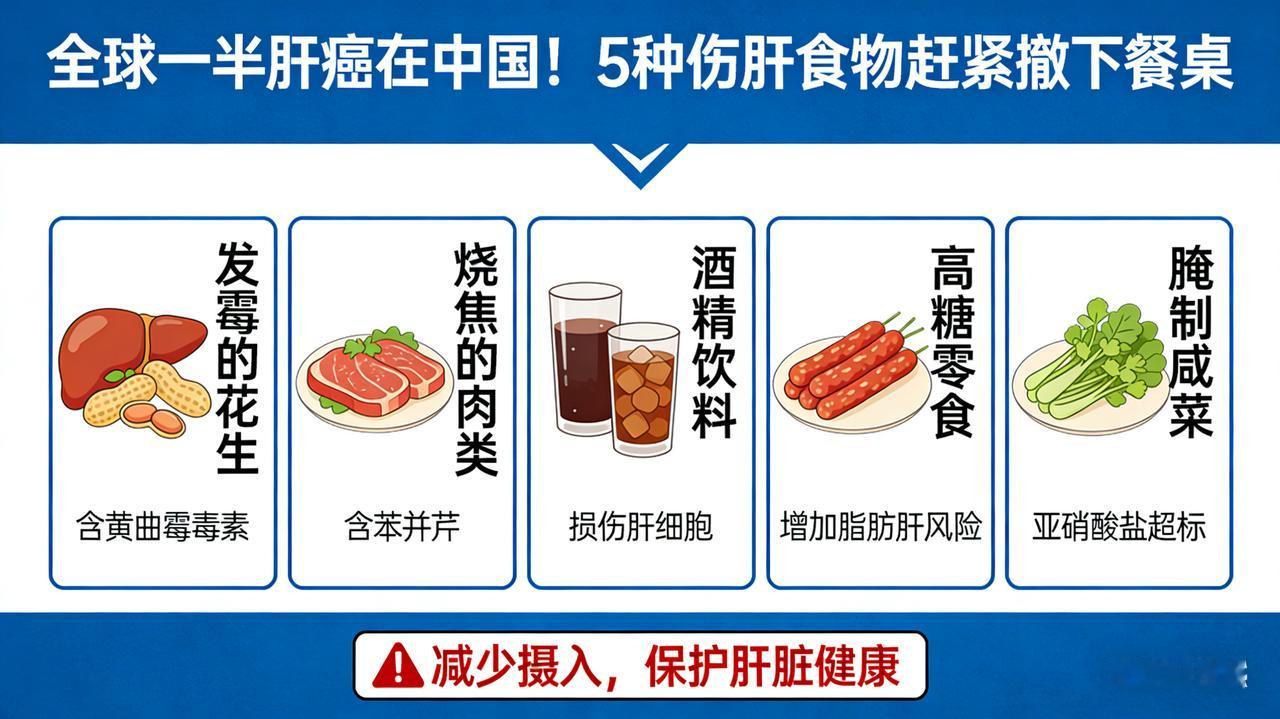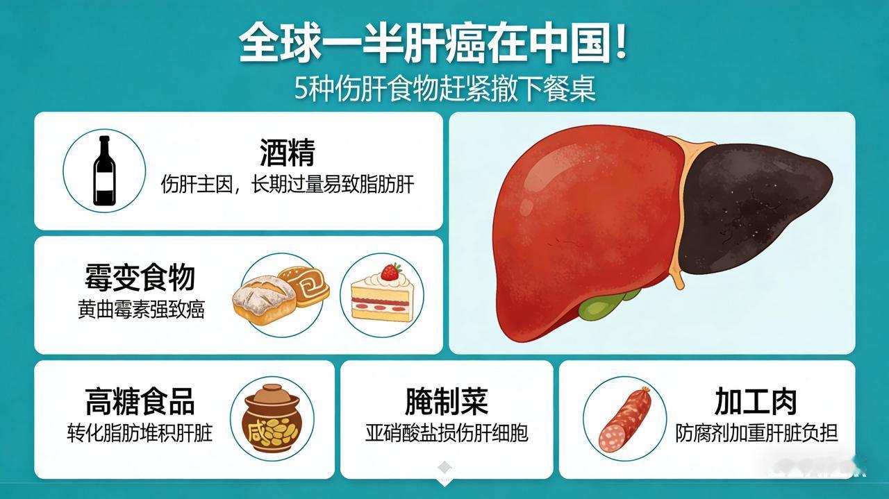 全球一半肝癌在中国!5 种伤肝食物赶紧撤下餐桌 全球近半肝癌“花落”中国!速查:家中这 5 类食物是肝脏“头号杀手”,快撤桌! 在健康威胁编织的巨大“黑暗森林”里,肝癌恰似一头凶猛且极度隐匿的洪荒猛兽,于全球范围内悄无声息却又肆无忌惮地肆意捕猎生命。当一串冰冷而残酷的数据赤裸裸地摆在眼前——全球接近一半的新发肝癌病例,竟都无情地如陨石般砸落在中国这片土地上,每一个数字都似一把锋利且冰冷的匕首,直直刺痛着国人的心,更如同一记响彻云霄、振聋发聩的警钟,急切且猛烈地唤醒我们每一个人对肝脏健康刻不容缓的重视。 更令人胆战心惊的是,潜藏在我们日常饮食这片看似平静无波的“海洋”中的一些“隐形刺客”,正如同狡黠的幽灵,悄无声息地为肝癌的滋生繁衍搭建起一个个罪恶的温床。家中那看似平常无奇、再普通不过的 5 类食物,实则是不折不扣的肝脏“头号杀手”,为了我们宝贵的健康,为了守护肝脏这片生命的“绿洲”,必须果断且坚决地将它们从餐桌上撤下! 霉变食物:黄曲霉毒素的“致命陷阱” 玉米、花生、坚果等谷物和干果,本应是餐桌上的美味珍馐,是大自然慷慨馈赠给我们的营养宝藏。然而,一旦它们不幸受潮发霉,就会瞬间从天使沦为恶魔,沦为黄曲霉毒素的“罪恶巢穴”。这种毒素堪称“毒性霸主”,其毒性之强,竟是砒霜的 68 倍之多!它就像一颗微型却又威力无穷的炸弹,一旦进入肝脏这个身体的“化工厂”,便会疯狂地、肆无忌惮地攻击肝细胞,让肝脏在瞬间千疮百孔、满目疮痍。哪怕只是极其微量的摄入,长期积累下来,也会如同一把把锋利且无情的利刃,逐渐切断肝脏的正常功能,最终无情地引发肝癌,将生命拖入无尽的深渊。所以,一旦发现食物表面有霉斑,或者散发出一股刺鼻难闻的哈喇味,千万别犹豫、别心疼,立刻毫不犹豫地扔进垃圾桶,绝不能让这“致命陷阱”有机会伤害我们脆弱的肝脏。 咸菜、腊肉、咸鱼等腌制食品,以其独特的风味和浓郁的口感,成为许多人餐桌上的“常客”,是记忆中难以割舍的“舌尖诱惑”。然而,在这诱人风味的背后,却隐藏着一个巨大的健康危机。在腌制过程中,大量亚硝酸盐会如幽灵般悄然滋生。当这些食物进入人体后,亚硝酸盐会迅速“变身”为致癌物质亚硝胺。它就像一个狡猾至极、阴险毒辣的间谍,在肝脏中悄然潜伏下来,不动声色地不断破坏肝细胞的结构和功能,大大增加肝癌的发病风险,让生命在不知不觉中陷入危险的境地。为了肝脏的健康,为了远离肝癌的威胁,还是尽量和这些腌制食物说“再见”吧,别让一时的口腹之欲成为健康的“绊脚石”。 油炸食品、动物内脏等高脂食物,虽然口感香醇、美味诱人,让人垂涎欲滴、欲罢不能,但它们却是肝脏的“甜蜜负担”,是隐藏在美味背后的健康“杀手”。长期大量食用,肝脏就像一台超负荷运转的老旧机器,在无尽的疲惫中苦苦挣扎。脂肪无法及时被代谢,会在肝细胞内不断堆积,形成脂肪肝。这就像给肝脏裹上了一层厚厚的、沉重的“棉被”,让它无法正常呼吸和工作,逐渐失去往日的活力。如果不加以控制,脂肪肝会如同恶魔般逐渐恶化,发展为肝硬化,最终可能演变成肝癌,将生命推向万劫不复的深渊。所以,为了肝脏的“轻松”,为了拥有一个健康的身体,还是少吃高脂食物为妙,别让一时的贪嘴毁了一生的健康。 酒精,在社交场合中常常扮演着“润滑剂”的角色,是人们沟通情感、交流思想的“媒介”。然而,它却是肝脏的“头号公敌”,是伤害肝脏的“罪魁祸首”。酒精进入人体后,主要依靠肝脏进行代谢。长期饮酒,肝脏就像一个被不断压榨的“海绵”,在酒精的侵蚀下逐渐失去弹性。肝细胞会反复受到损伤、变性、坏死,从最初的酒精性脂肪肝,到酒精性肝炎,再到酒精性肝硬化,最后可能走向肝癌的深渊。每喝下一滴酒精,就如同给肝脏插上一把锋利的匕首,在不知不觉中侵蚀着肝脏的健康。为了肝脏的长治久安,为了拥有一个幸福美满的人生,还是尽早戒酒,远离这“慢性毒药”,让肝脏重新焕发生机与活力。 木耳,本是一种营养丰富、口感爽滑的健康食材,是大自然赐予我们的美味佳肴。然而,如果泡发时间过长,就会产生一种可怕的毒素——米酵菌酸。这种毒素对肝脏、肾脏等多个器官都有强烈的损害作用,严重时甚至会危及生命。它就像一个隐藏在黑暗中的杀手,在不经意间给我们的健康带来致命一击,让我们在毫无防备的情况下陷入危险的境地。所以,泡发木耳时一定要注意时间,一般冷水泡发 2 - 3 小时即可,切不可长时间浸泡,让这“藏身暗处”的毒素无机可乘,守护好我们 肝脏,是我们身体的“化工厂”,是生命得以正常运转的重要保障。它默默承担着解毒、代谢等重要任务,为我们抵御着外界的各种伤害。为了守护肝脏的健康,为了远离肝癌的威胁,让我们从现在开始,仔细检查家中的餐桌,把这 5 类食物果断撤下。同时,保持均衡的饮食、适量的运动和定期的体检,为肝脏筑起一道坚不可摧的防线,让健康与我们一路同行,让生命绽放出绚丽的光彩!