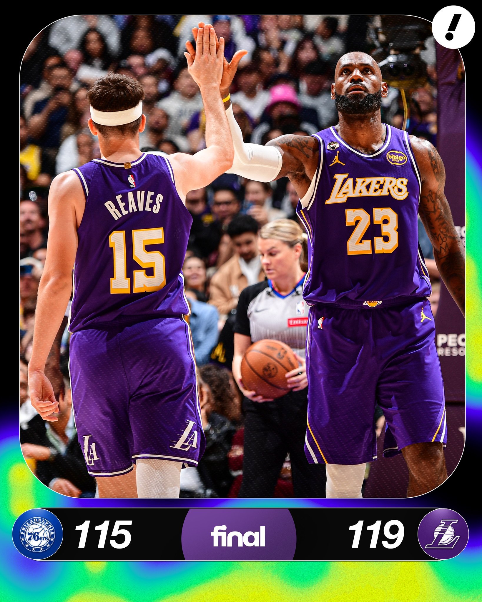里夫斯25min轰35分6篮板,湖人队史用时最少的35+,帮助湖人又一次关键球决胜,战胜76人。76人vs湖人NBA