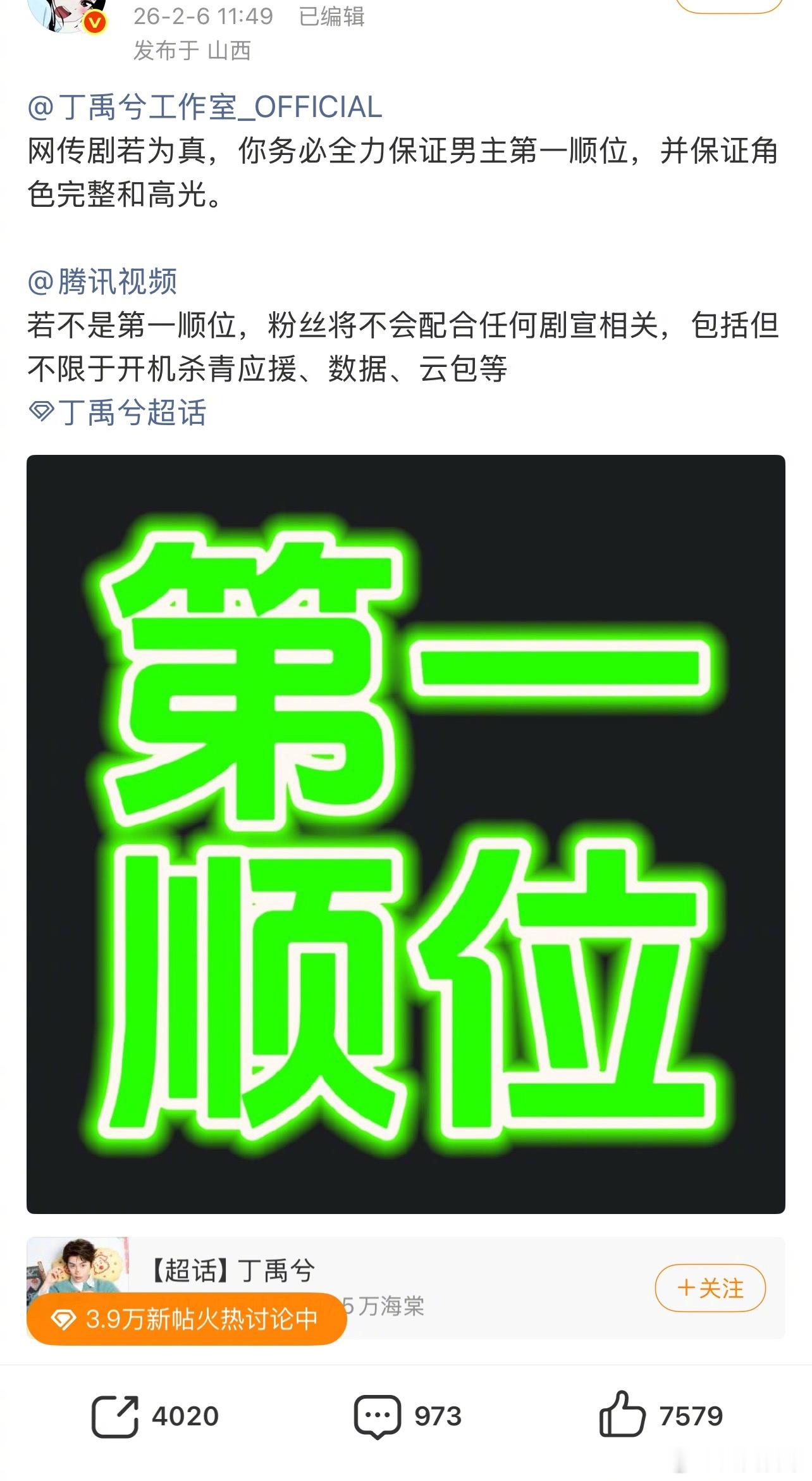 网传《司宫令》女主宋祖儿、男主丁禹兮。丁禹兮粉丝表示必须保证男主第一顺位