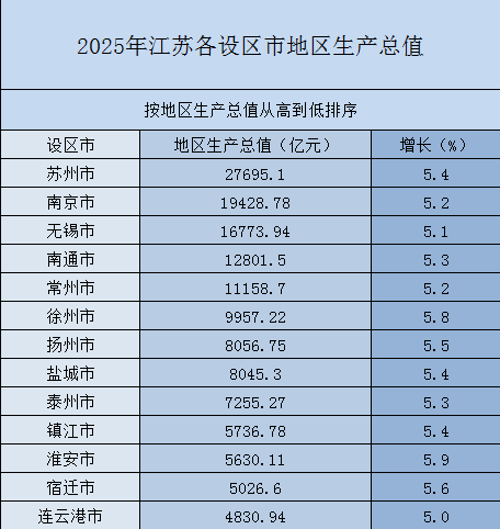 2月5日,淮安市统计局官网显示,2025年淮安市地区生产总值为5630.11亿元。至此,2025年江苏13个设区市地区生产总值正式揭榜。