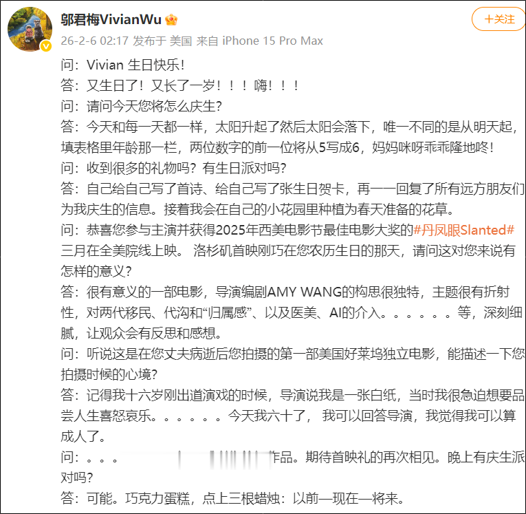 2月5日,是演员邬君梅60岁的生日,邬君梅在其个人社媒账号上发布了对相关采访的回应,她分享了庆生方式:为自己写诗、制作贺卡、回复朋友祝福,并在小花园种植花草迎接春天,感慨年龄从“5”字头迈入“6”字头。采访中,邬君梅还透露丈夫已病逝。