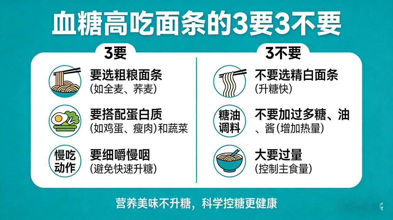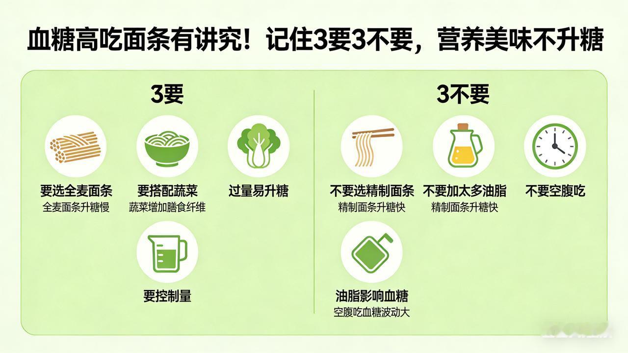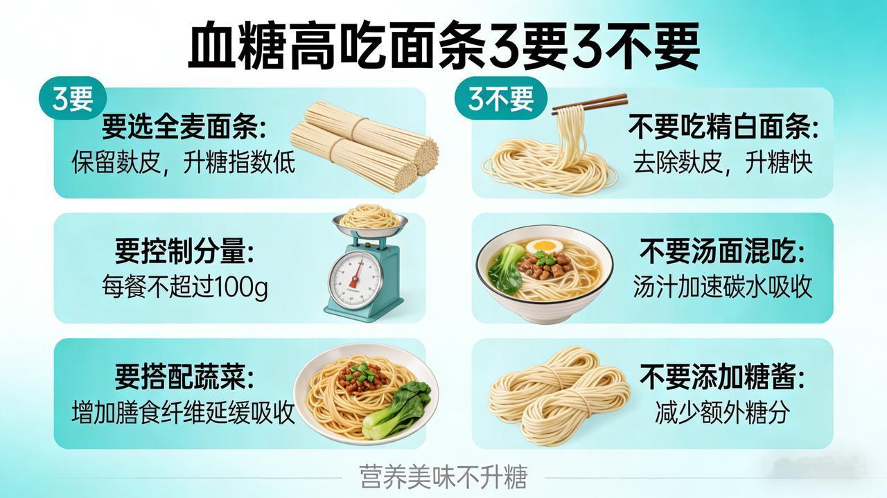 血糖高吃面条有讲究!记住 3 要 3 不要,营养美味不升糖 血糖高的人吃面条,牢记3要3不要,美味稳糖轻松享! 对于血糖偏高的人来说,面条就像个“甜蜜陷阱”——它香软可口,是日常餐桌上的常客,能带来满满的饱腹感与满足感;可一旦吃不对,血糖便会如脱缰野马般飙升,让人忧心忡忡。不过别担心,今天就为大家揭秘吃面条的“3要3不要”黄金法则,让您在享受面条美味的同时,稳稳把血糖“拿捏”住! 3要:科学搭配,稳控血糖的“秘密武器” 选对面条种类——开启健康饮食的钥匙 想象一下,有一种面条就像神奇的“血糖稳定器”,能帮您抵御血糖上升的“攻击”,它就是全麦面条、荞麦面条、莜麦面条等粗粮制成的面条。这些面条富含膳食纤维,如同给肠胃安装了一个“减速带”,能显著减缓食物的消化吸收速度,让血糖上升变得平缓而温和。以全麦面条为例,它完整保留了小麦的麸皮和胚芽,就像把小麦的精华都浓缩其中,不仅营养丰富,升糖指数相较于普通白面条大幅降低,简直是血糖高人群的“梦中情面”! 搭配丰富配菜——打造营养均衡的盛宴 吃面条可不能“孤军奋战”,搭配上丰富多样的配菜,才能让营养更全面。瞧那翠绿的菠菜,娇艳的西兰花,清爽的黄瓜,它们就像一群绿色的健康小卫士,富含膳食纤维和维生素,能增加饱腹感,减少面条的摄入量。还有那嫩滑的鸡蛋、鲜美的瘦肉、细腻的豆腐,它们是身体的“能量基石”,为身体提供优质蛋白,有助于维持正常代谢,让血糖稳如泰山。想象一下,一碗香气四溢的西红柿鸡蛋打卤面,搭配一份爽口的凉拌黄瓜,色彩斑斓,营养丰富,每一口都是满满的健康与美味! 控制食用量——把握健康饮食的尺度 即使是粗粮面条,也不能毫无节制地大快朵颐。就像给饮食设定一个“安全警戒线”,一般来说,每餐主食的量控制在100 - 150克(生重)为宜。不妨使用较小的碗来盛面条,这就像给自己的食欲施了一个小小的“魔法”,巧妙地控制食量,避免因过量进食而导致血糖失控。 3不要:规避误区,远离升糖的“雷区” 拒绝喝面条汤——切断升糖的“隐形通道” 面条汤看似清淡,实则暗藏“升糖玄机”。它就像一个隐藏的“糖分炸弹”,其中含有大量从面条中溶解出来的淀粉,喝下去后,血糖会迅速攀升。所以,血糖高的人吃面条时,最好果断将汤倒掉,就像关上了血糖上升的“侧门”,不给它任何可乘之机。 避免煮得太软烂——保留面条的“健康韧性” 面条煮得越软烂,消化吸收就越快,血糖上升也会如火箭般迅速。煮面条时,要像一位技艺精湛的厨师,精准掌握火候和时间,让面条保持一定的嚼劲。这嚼劲就像面条的“健康密码”,既能让您享受美味,又能延缓血糖上升,让您的每一口都吃得安心又健康。 摒弃高糖高油调料——守护身体的“健康防线” 像甜面酱、沙拉酱、油炸花生米等调料,它们就像一群“甜蜜的诱惑者”,热量高且含糖量惊人,会加重身体代谢负担,导致血糖如同过山车般波动。不妨选择醋、生抽、蒜末等低热量调料来为面条增添风味,它们就像健康的“调味精灵”,既能让面条美味升级,又能守护您的身体健康。 血糖高的朋友们,只要遵循这些“3要3不要”的法则,就能在享受面条美味的同时,轻松掌控血糖,拥抱健康美好的生活!让我们一起开启这场美味与健康并存的饮食之旅吧!