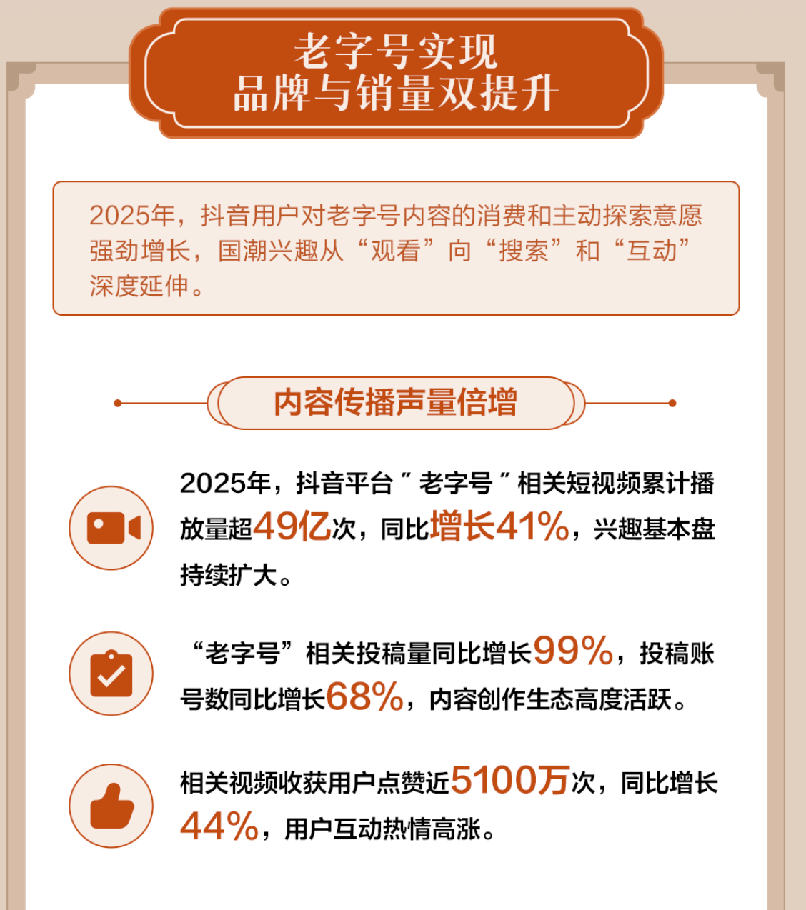 《报告》显示,2025年,抖音用户对中华老字号的热情已从“观看”深度延伸至“搜索”与“互动”。平台内“老字号”相关短视频累计播放量超过49亿次,同比增长41%。内容创作生态更为活跃,投稿量与投稿账号数分别同比增长99%和68%,体现出各方参与传播的积极性。