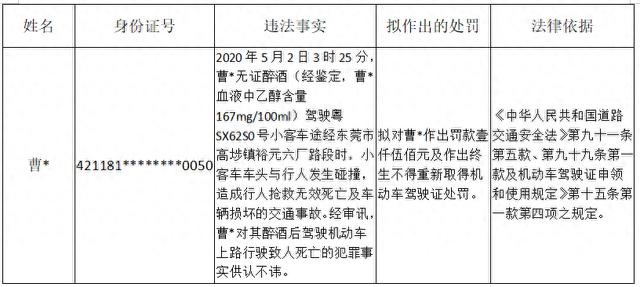 机动车驾驶人曹某,因无证醉酒后驾驶机动车上路行驶致一人死亡且肇事后逃逸,构成交通肇事罪,现当事人未在法定期限内接受处理。根据《中华人民共和国行政处罚法》第四十四条、《公安机关办理行政案件程序规定》第一百六十八条等规定,现将其对应违法事实、理由和处罚依据公告告知如下,根据《中华人民共和国行政处罚法》第四十五条、第六十三条及第六十四条的规定,当事人有提出陈述和申辩、要求听证的权利。