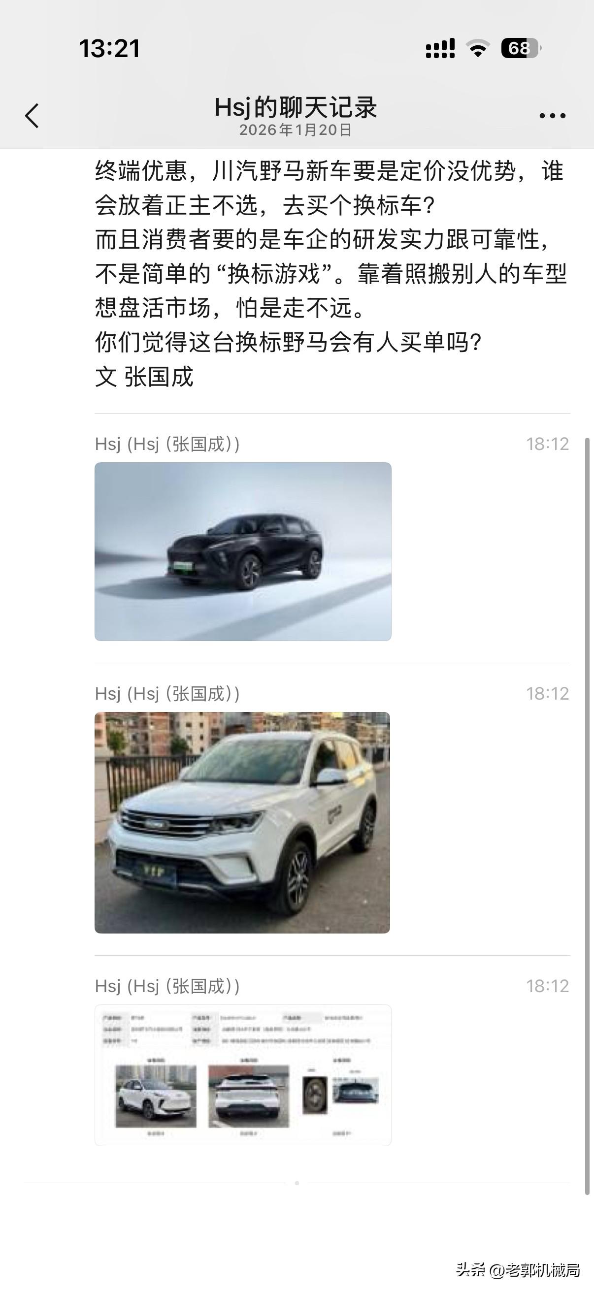 还在猜老牌车企复出会有啥招数,真没想到会是这样....... 不知道大家有没有听说过川汽野马这个车企,跟福特野马没有任何关系啊,是一个成立30多年现在却濒临倒闭的车企,居然公示了新车,结果定睛一看,这不就是换了标的25款东风风行雷霆吗? 车身尺寸、轴距跟风行雷霆几乎一模一样,连其它的核心参数也都没改,唯一的区别就是车标换了,等于买壳子送“全套参数”,这波“拿来主义”玩得是真溜。 说真的,这种直接换标不改动的操作,实在没什么诚意。风行雷霆本身12.99万起售,还有终端优惠,川汽野马新车要是定价没优势,谁会放着正主不选,去买个换标车? 而且消费者要的是车企的研发实力跟可靠性,不是简单的“换标游戏”。靠着照搬别人的车型想盘活市场,怕是走不远。 你们觉得这台换标野马会有人买单吗?汽车人共创计划 文 张国成