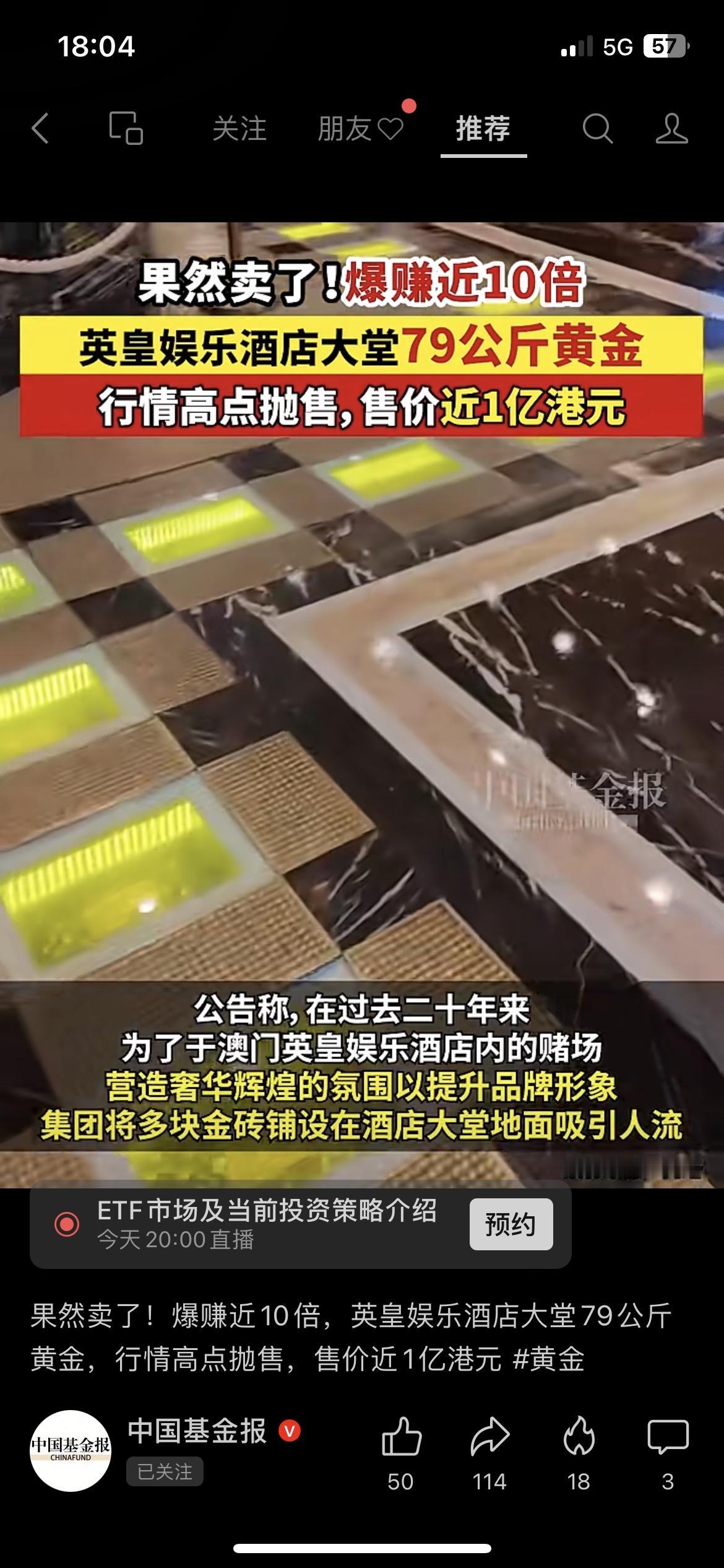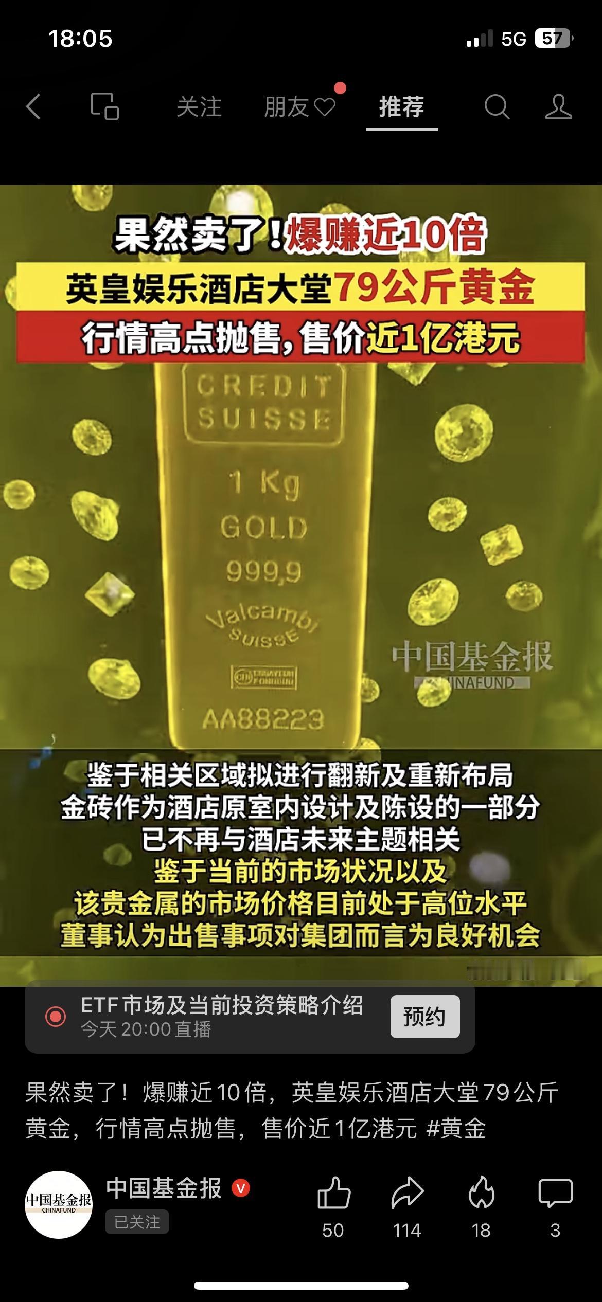 英皇卖金砖爆赚10倍!79公斤变现近亿! 大堂摆了20年的装饰金,变9000万纯利润,这才是实物黄金的正确打开方式,咱们普通人别乱买首饰金! 黄金别当首饰戴,当成资产配才划算 你觉得现在是囤黄金还是抛黄金的好时机? 实物黄金 英皇娱乐 黄金理财 财经热点 (市场有风险,投资需谨慎)