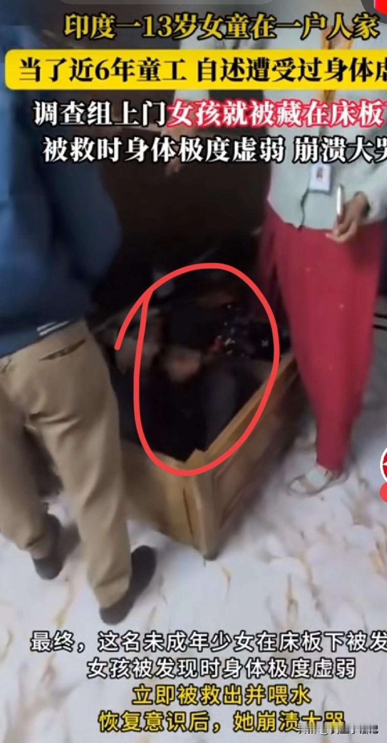 说出来你可能都不敢信,都2026年了,居然还藏着这种离谱的事。就在印度,有个才13岁的小姑娘,竟然已经在别人家做了6年帮工。算下来,她从7岁那年起,就没尝过童年该有的样子,每天不是洗衣做饭,就是打扫卫生。 这事儿能被发现,实在是有人看不下去报了警。相关部门接到举报后,赶紧带人上门调查,结果房主那反应,简直把“心里有鬼”写在了脸上。一开始死不承认家里有这么个小帮工,调查组追问得紧了,就开始东拉西扯瞎编:一会儿说“女孩早就被她爸接回老家了”,一会儿又改口“孩子正在睡觉,不方便出来见人”,前后说辞对不上,明眼人一看就知道在撒谎。 更让人起疑的是,男房主居然直接躺到卧室床上,赖着不起来,说什么也不让调查组搜查。这操作谁看了不觉得蹊跷啊?调查组也没惯着他的无理取闹,强硬要求他起身配合。 等工作人员把床垫掀开、移开床板的那一刻,所有人都被惊到了:床底下居然藏着个小姑娘!身上还盖着薄薄的被子,上面甚至压着木板,明显是怕被人发现,故意把她死死堵在这狭窄的空间里。 那女孩被救出来的时候,整个人虚弱得站都站不稳,一看就是受了不少委屈。调查组赶紧给她递了瓶水,这孩子喝了两口,积攒了六年的委屈一下子涌了上来,哇的一声哭了出来。 都什么年代了,居然还存在这种离谱的帮工现象,而且还是这么小的孩子。好在现在女孩已经被解救,相关部门也在调查涉事房主,希望她能被妥善安置,早日走出阴影,有机会重新走进校园,弥补错失的时光。也希望这样的悲剧能少一点,再少一点,每个孩子都能拥有属于自己的快乐童年,不用早早承担不属于这个年纪的重担。