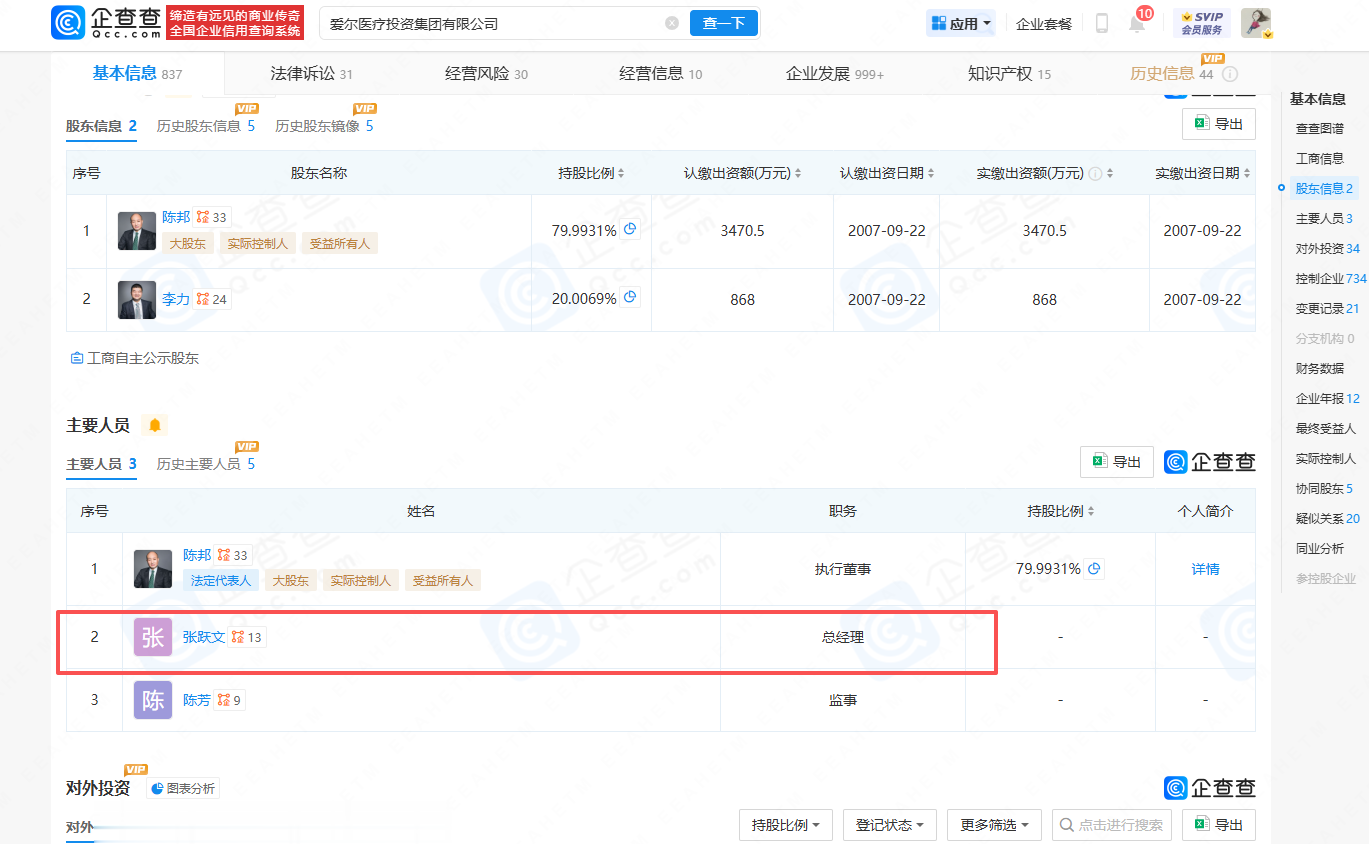 陈邦目前的资本版图相当庞大。据企查查,其控制的爱尔医疗投资集团成员企业数量高达682家,其中核心企业44家。