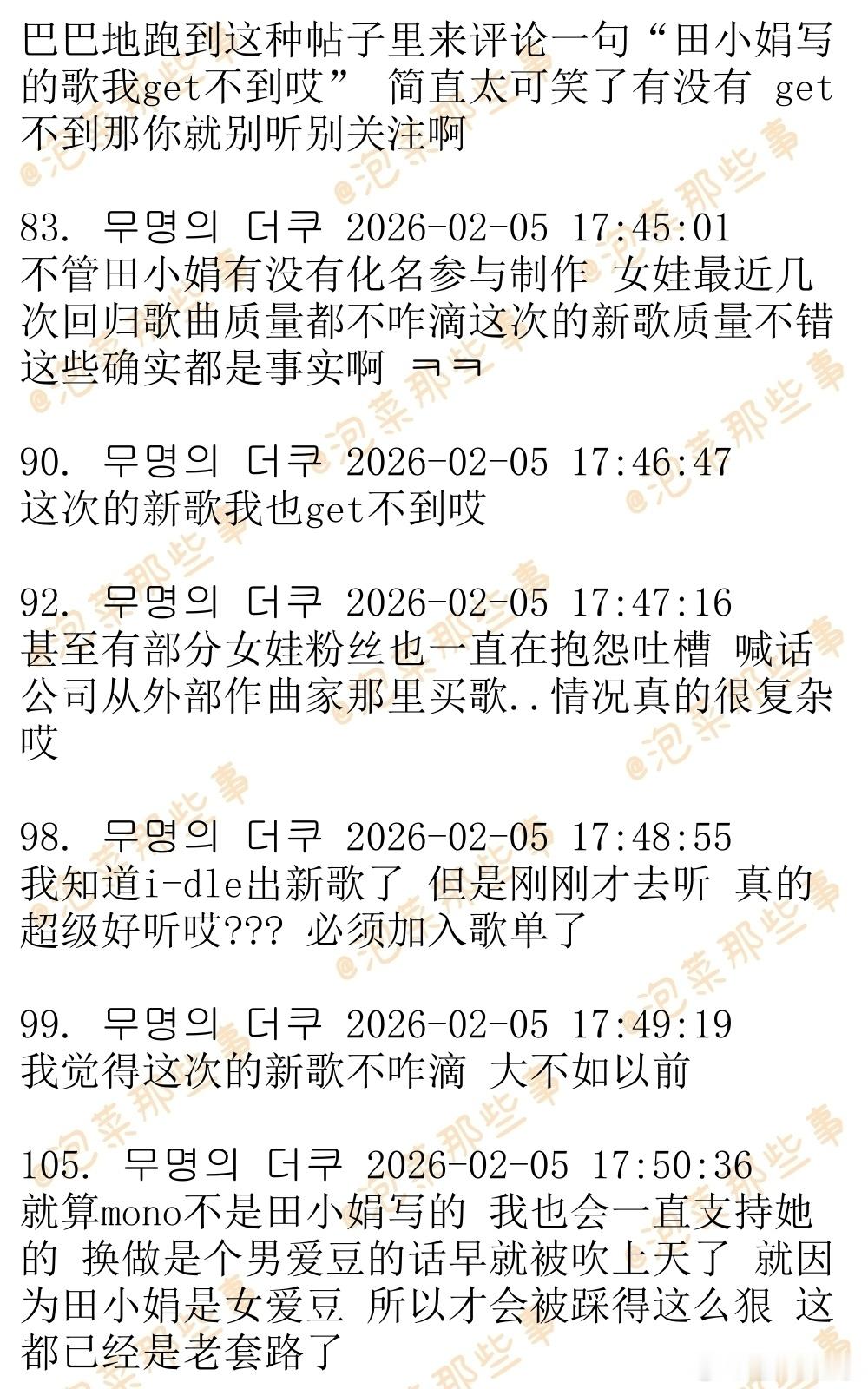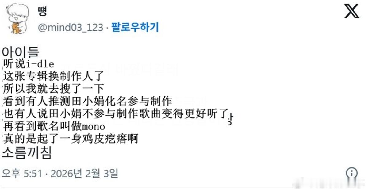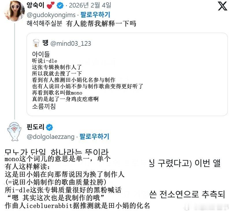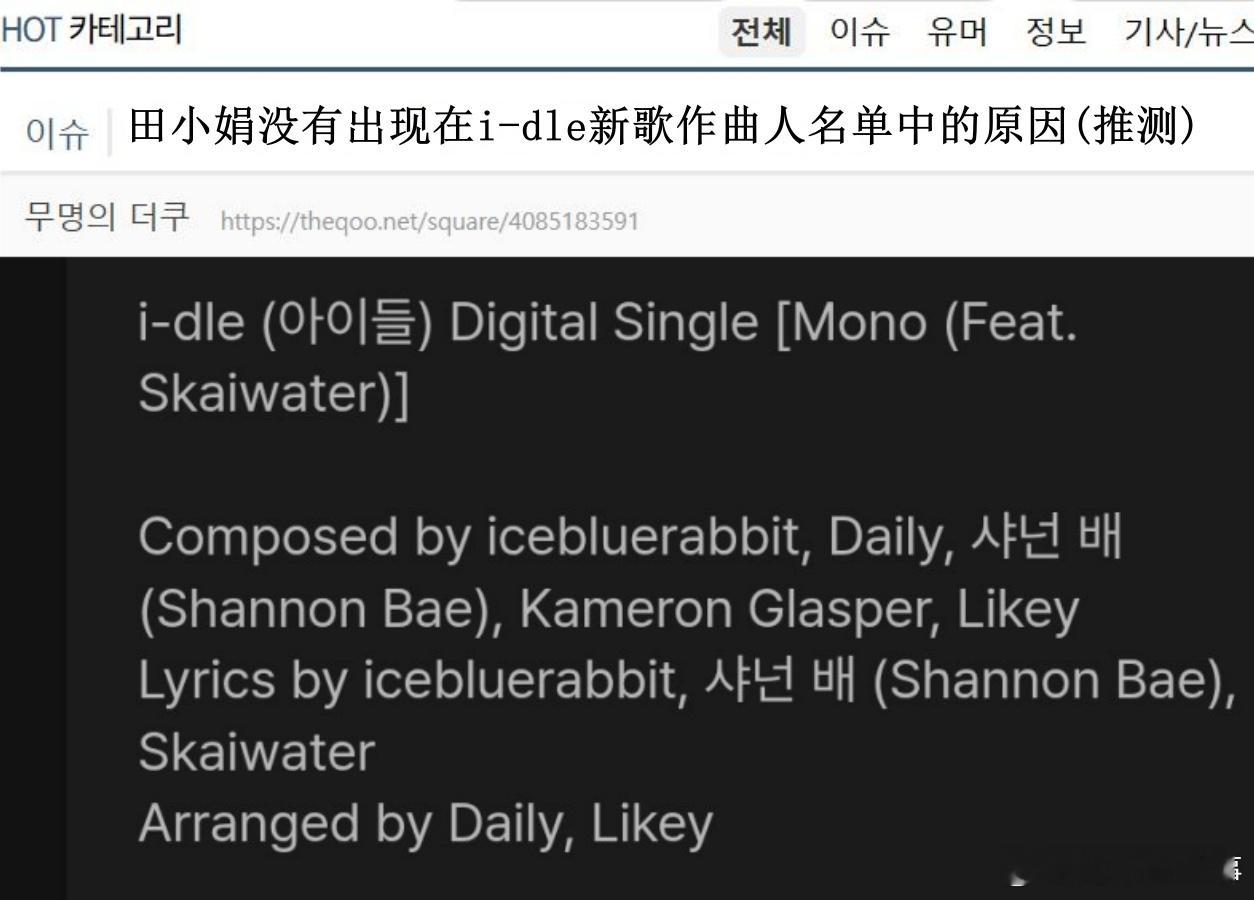 🔥韩网热帖评论翻译🔥田小娟没有出现在i-dle新歌Mono作曲人名单中的原因(推测)韩网原帖帖主称:这次i-dle新歌制作阵容里没有田小娟的名字 引发了诸多议论 粉丝们推测是田小娟故意隐藏了自己的名字 因为希望大家专注评价音乐本身고 这样看来 田小娟为组合制作歌曲真的是承受了巨大的压力啊 宁愿使用假名 也想要凭借音乐本身获得认可 ㅠㅠ 当然了 这位icebluerabbit也有可能是一位无名新人作曲家 但如果真的是田小娟的话 Mono这首歌蕴含的意义以及想要传达给大众的信息 真的是让人起了一身鸡皮疙瘩哎 总之 i-dle的Mono这首歌真的很好听 希望大家都去听一下 cr.theqoo