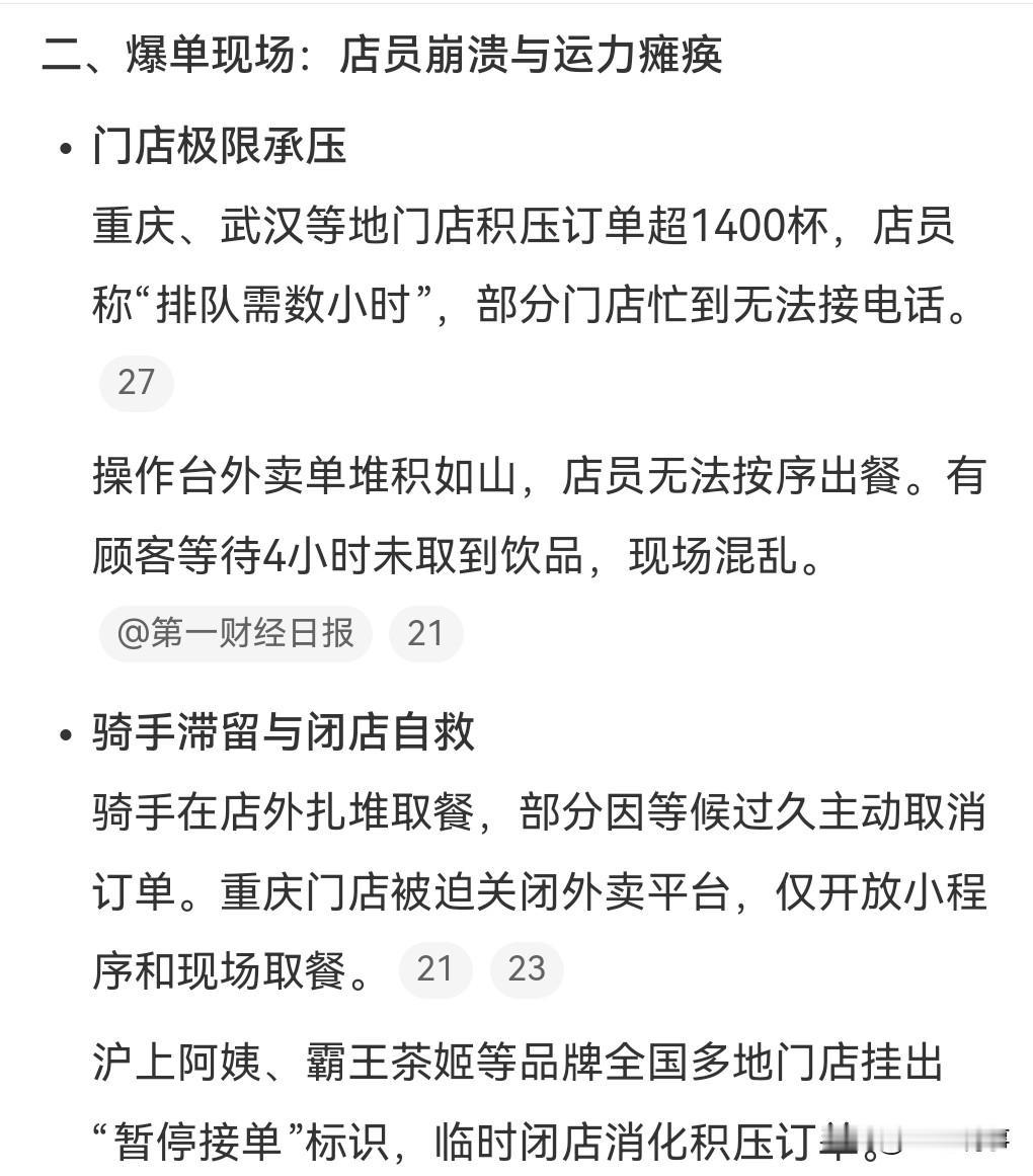 这样的活动还是少搞一点吧,造成那些奶茶店订单堆的太多,很多店都关门停止营业,有门店订单堆积到了1400多单,这哪里做得过来呀? 2月6日上午,千问搞了一个一分钱喝奶茶的活动,结果门店忙坏了,多家奶茶门店爆单闭店。 很多骑手等的不耐烦,无奈主动取消了订单。 活动上线后不到4小时,订单超过200万单。