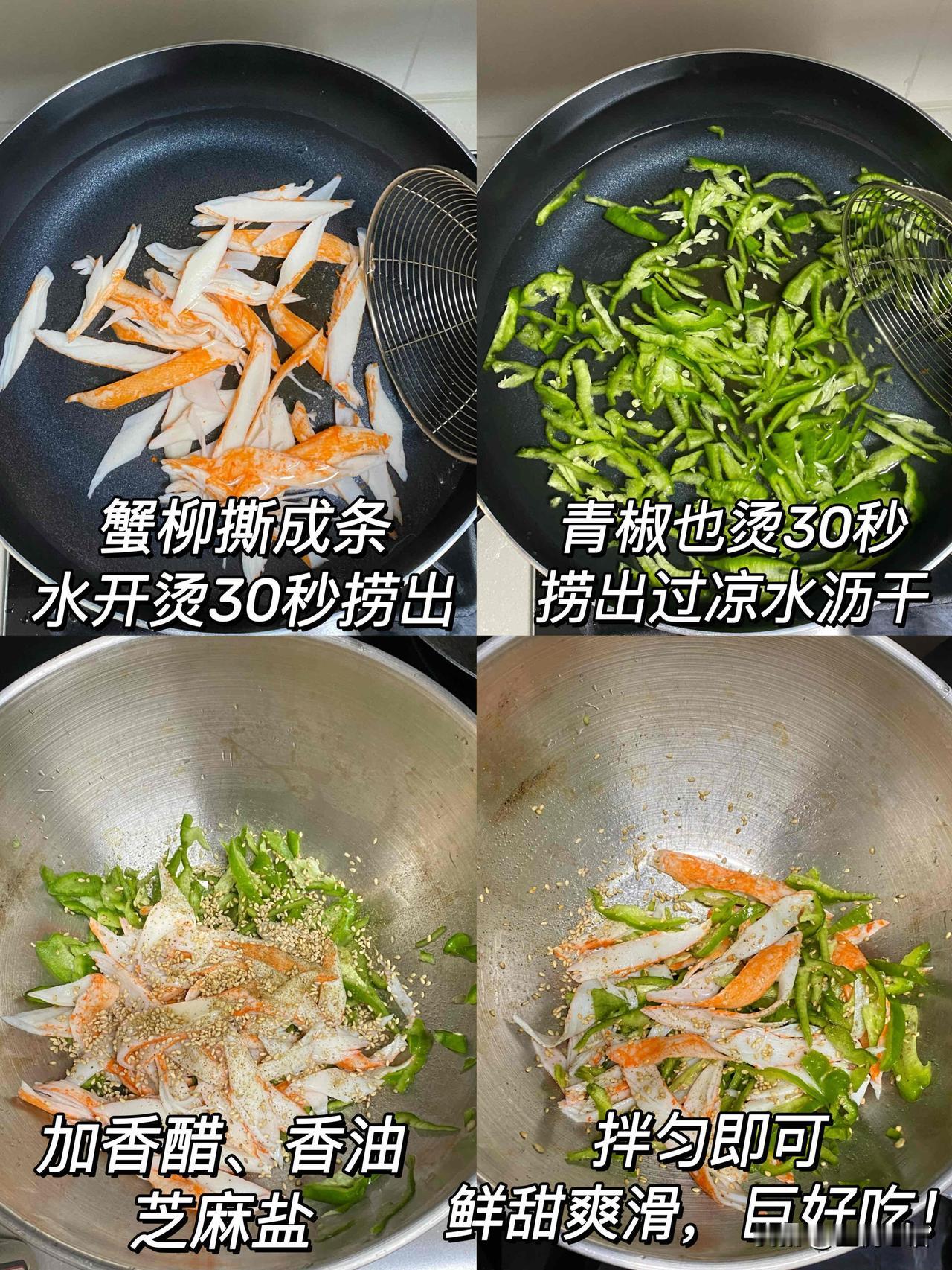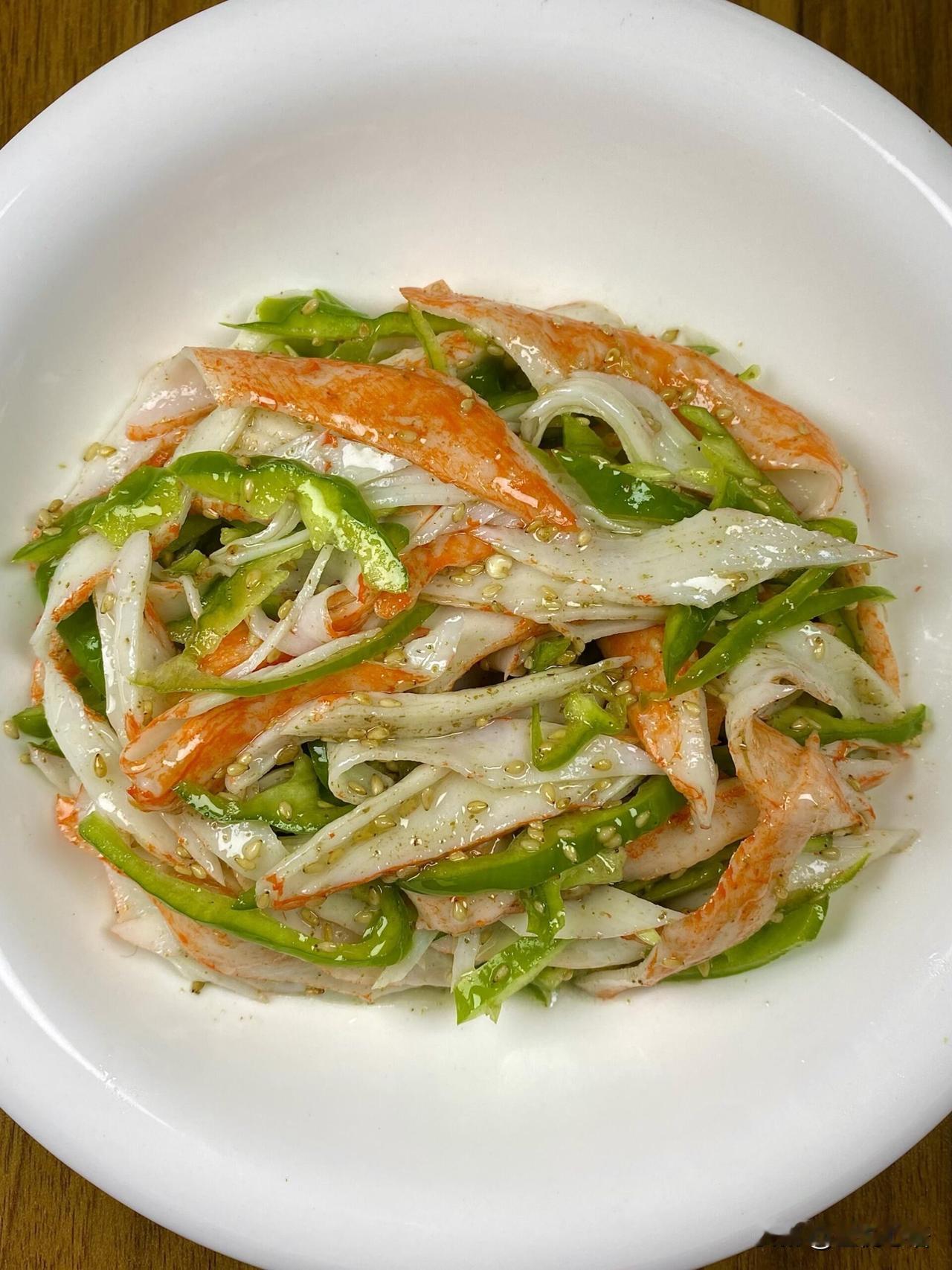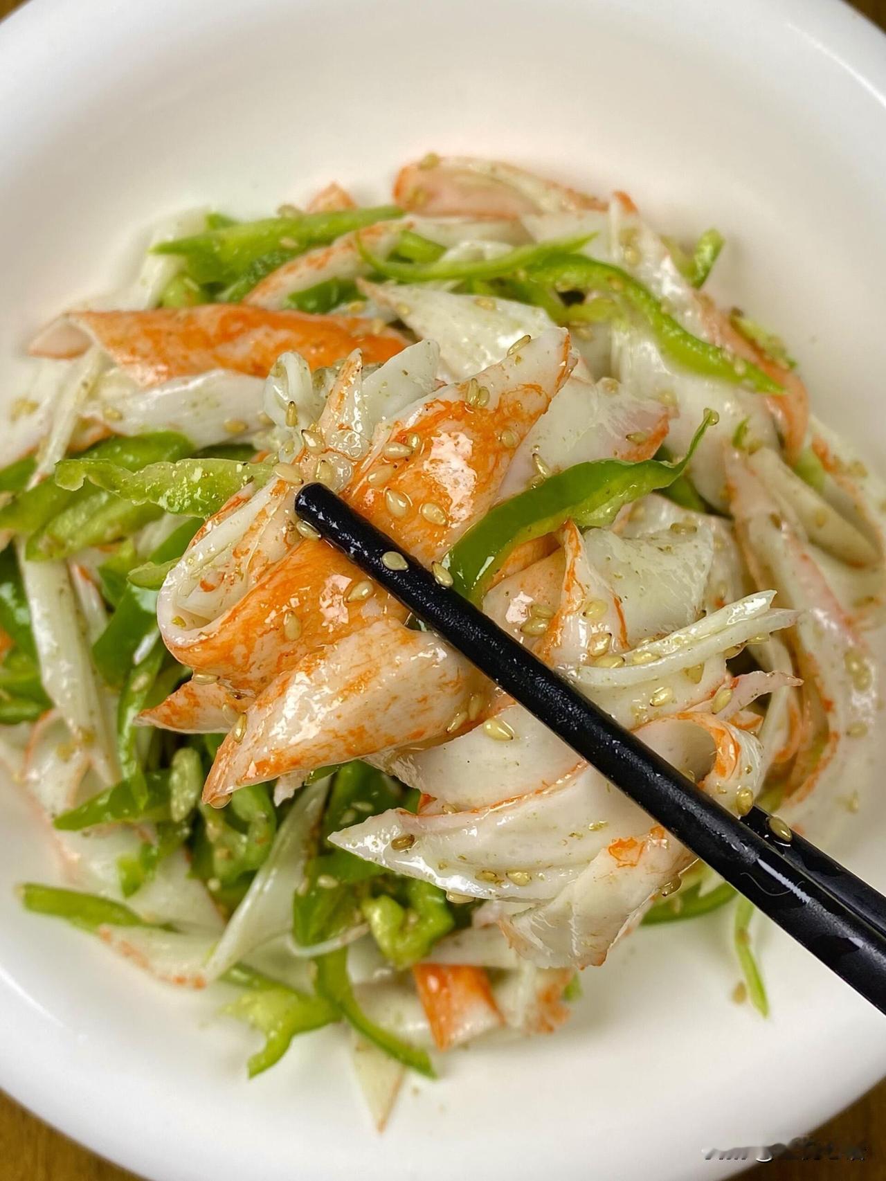 巨好吃的凉拌菜!香到迷糊 真的要夸爆这道芝麻青椒蟹柳! 亲戚家吃过一次就念念不忘 做法超简单,蟹柳青椒开水烫30秒 过凉水沥干,加香醋、香油、芝麻盐拌匀 口感清爽鲜脆,蟹柳滑嫩鲜甜 配米饭能多炫两碗 家常快手菜天花板,姐妹们快冲!