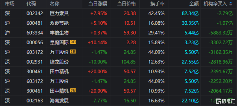 龙虎榜中涉及机构专用席位的个股中,当日净卖出额前三为巨力索具、双良节能、丰倍生物,分别为2.79亿元、1.07亿元、5883.32万元。