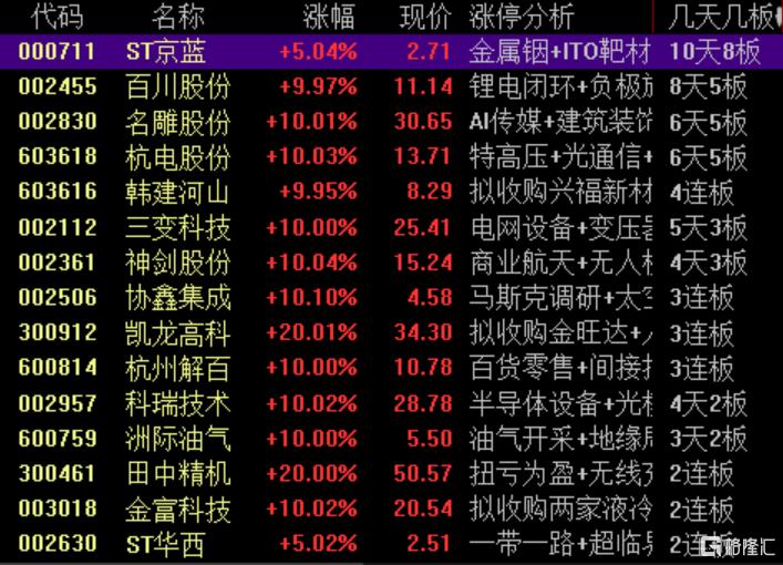 高位股方面,油气板块洲际油气13天7板,并购重组的凯龙高科20CM3连板,名雕股份、杭电股份均走出反包涨停录得6天5板。