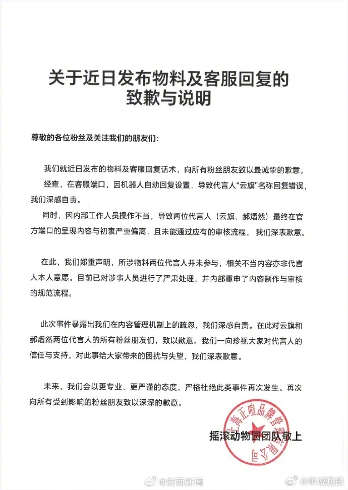 【#摇滚动物园擅自发艺人AI视频被解约#】#摇滚动物园刚被解约就火速道歉#近日,摇滚动物园在未告知经纪公司的情况下,于官方账号发布艺人云旗、郝熠然的AI合成视频物料。该物料被指内容低俗,且艺人形象被扭曲(如恶意剪辑眨眼、说话等动作),严重损害艺人公众形象,引发关注。2月6日,发文关于终止与「摇滚动物园」品牌合作的正式声明今日「摇滚动物园」品牌官宣合作后,我司第一时间监测到,品牌方官方账号在未履行任何知会义务,未获我方审核许可的前提下,擅自发布含艺人形象的AI合成物料,该物料严重损害到了艺人形象。基于品牌方的违约及侵权事实,经我司审慎评估与研究决定:即日起正式终止与「摇滚动物园」品牌的一切合作关系。后续,我司将委托专业律师团队处理合作终止的相关法律程序,并保留追究品牌方相应法律责任的权利,以维护艺人的合法权益不受侵害。随后,发文关于近日发布物料及客服回复的致歉与说明:我们就近日发布的物料及客服回复话术,向所有粉丝朋友致以最诚挚的歉意。经查,在客服端口,因机器人自动回复设置,导致代言人"云旗"名称回复错误,我们深感自责。同时,因内部工作人员操作不当,导致两位代言人(云旗,郝熠然)最终在官方端口的呈现内容与初衷严重偏离,且未能通过应有的审核流程,我们深表歉意。在此,我们郑重声明,所涉物料两位代言人并未参与,相关不当内容亦非代言人本人意愿。目前已对涉事人员进行了严肃处理,并内部重申了内容制作与审核的规范流程。此次事件暴露出我们在内容管理机制上的疏忽,我们深感自责。在此对云旗和郝熠然两位代言人的所有粉丝朋友们,致以歉意。我们一向珍视大家对代言人的信任与支持,对此事给大家带来的困扰与失望,我们深表歉意。(封面新闻) (编辑:郑宗敏;审签:谢杨柳)