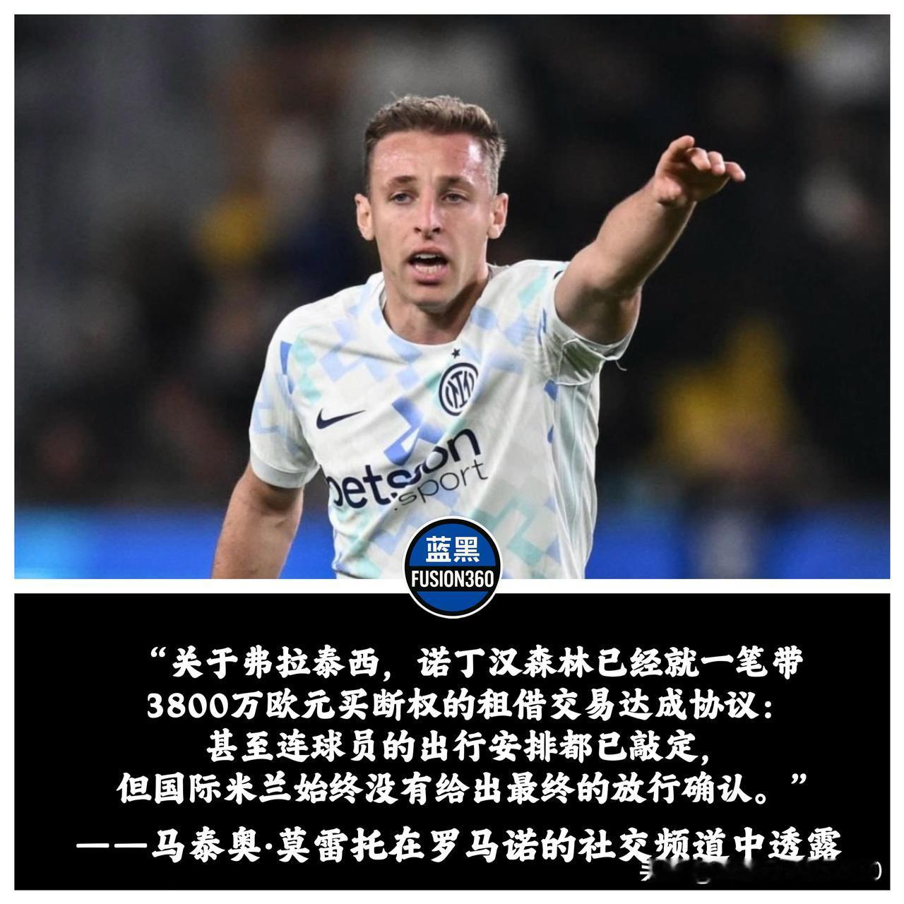 转会内幕:弗拉泰西只差一步去英超!3800万协议已达成,最后时刻因“他”叫停 转会窗虽然关了,但刚刚曝出的这个内幕,足以让所有内拉惊出一身冷汗。根据转会专家莫雷托在罗马诺频道的最新爆料:我们的中场大将弗拉泰西,在截止日前实际上已经“无限接近”离队。这可不是捕风捉影,这是真刀真枪的谈判。 当时的情况比外界想象的要惊险得多: 国米已经与英超球队诺丁汉森林完全谈妥了所有细节。交易方式非常具体:有偿租借 + 3800万欧元买断权。甚至连球员飞往英格兰的行程表都快排好了,这笔交易距离官宣,真的只差临门一脚。 然而,就在签字画押的最后读秒阶段,国米高层猛踩了刹车。这笔价值3800万欧元的交易,在最后一刻胎死腹中。理由非常现实,也非常无奈:因为没有替代者。为了保证下半赛季中场的厚度,马洛塔和奥西利奥最终拒绝给出最后的离队许可。 这波“临阵撤回”,大家怎么看? 是庆幸留住了弗拉泰西保住了阵容厚度,还是惋惜错过了一次绝佳的高位套现机会?国际米兰 💙🖤