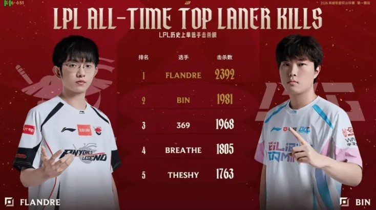 LPL历史上单选手击杀榜:Flandre位列第一,Bin位列第二