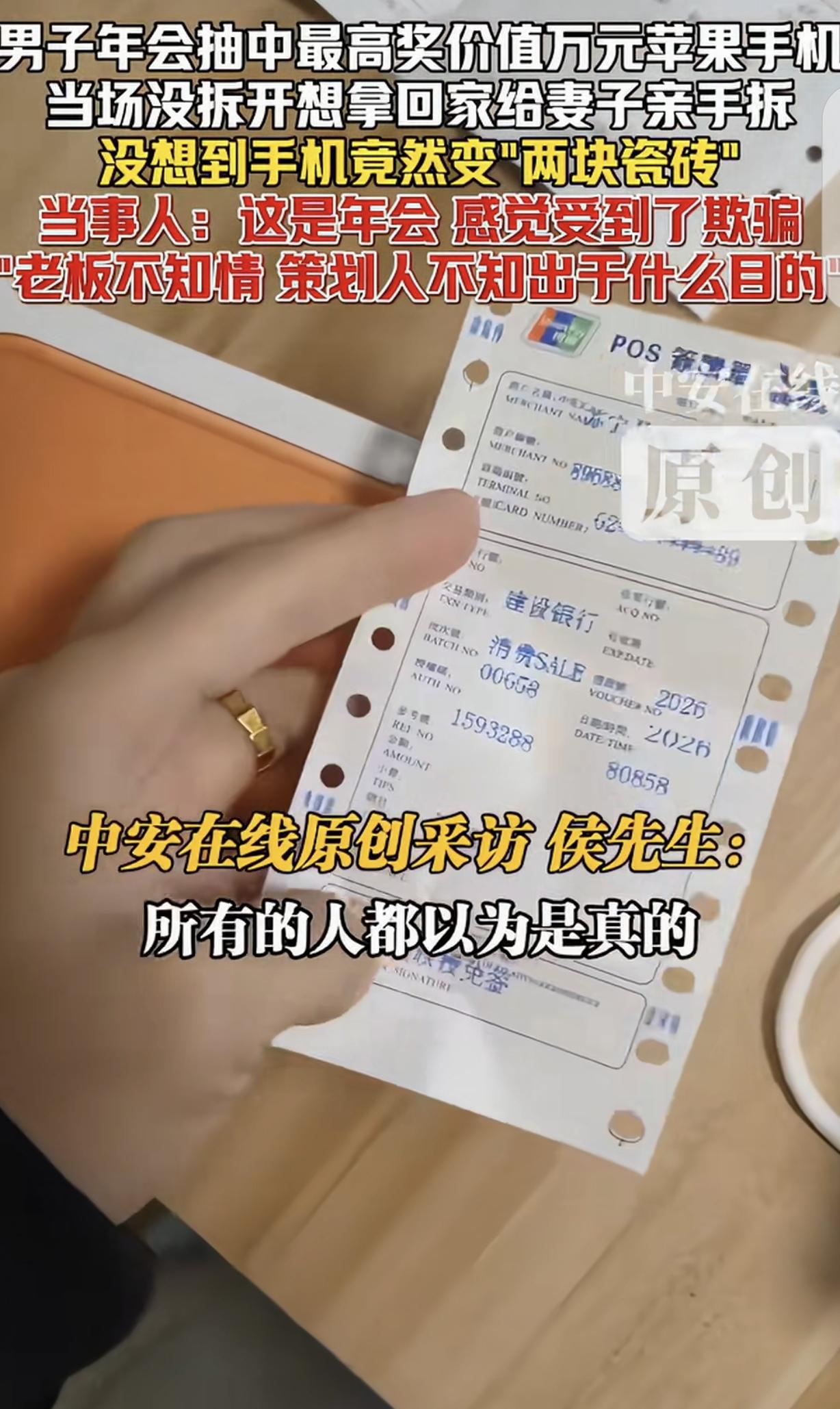 “玩不起别玩!”广东,一男子年会撞大运,抽中价值9988元最新款苹果手机,还是老板给他颁奖,他心花怒放,现场没拆包验货,就带回家给了妻子,可当妻子打开瞬间傻眼,手机竟然变成2块瓷砖和几颗巧克力,压根没手机,男子怒了,让他惊讶的是,老板也被蒙在鼓里,公司所有人都以为是真手机,是策划人搞的鬼,男子觉得自己被耍了,他要求策划人,当着全公司员工的面,给自己鞠躬道歉! 2月3号晚上,侯先生公司聚餐年会,听说现场有抽奖活动,特等奖是一部价值9988元的最新款苹果手机。 公司所有人都跃跃欲试,虽然嘴上不说,但暗地里较劲,都希望自己才是那个幸运儿。 侯先生被安排负责年会拍摄,当然了,他也想抽中特等奖,正好春节想给妻子送件礼物,如果手机被他抽中,送给妻子她肯定高兴,自己也省了一大笔钱。 但侯先生知道,自己运气没那么好,想想过过瘾得了。 可他万万没想到,特等奖竟然花落他家,当主持人说出他的名字时,他大脑一片空白,好半天才反应过来,顿时心花怒放。 而且,是公司老板亲自颁奖,侯先生上台领奖时,心里的激动溢于言表,看着同事们投来艳羡的目光他很是满足。 放在一般人身上,肯定现场拆开包装,取出手机跟大家展示一下,但侯先生没有打开,因为他想把手机当新年礼物送给妻子。 可万万没想到,当妻子听说他中奖了,还是价值9988元的苹果手机,她欣喜若狂从他手里接过手机包装盒,迫不及待打开时,夫妻俩当场懵圈。 手机盒里哪来的手机呀,竟然上面有几颗巧克力,下面是两块小瓷砖。 侯先生怒从心起,后来他才知道,老板包括公司所有人都不知情都以为手机是真的。 这件事是策划人搞的鬼,他什么目的,侯先生猜不透,是整蛊?是恶搞?是等侯先生现场拆开时,一看是两块瓷砖,为了看他什么反应?什么表情? 但既然他没现场打开,策划人就应该告诉他实情,而不是他都把手机拿回家了,还不告诉他里面是假的。 侯先生很愤怒,年会那么正式的场合,自己却被如此戏弄,成了全公司的笑话,他认为自己被耍了,至于手机给不给他无所谓,他要求策划人,当着全公司所有人的面给他道歉! 有人怀疑这绝非整蛊,明显是掉包。必须公开调查,让他在单位无地自容,别把人当傻子。 有人说侯先生有错,所有的问题都是他自己的问题。当场验货,让领导下不来台。 老板要开除策划这个事的人,把老板的面子丢地上踩!这老板真窝囊,这用这种弄虚作假的员工! 玩不起别玩。掉包这种伎俩很容易被拆穿,这年头谁会忍气吞声惯着公司。 这场闹剧里,策划人的操作最让人无语。公司年会是正式场合,说好的特等奖奖品,他私下偷偷换掉,既没和老板报备,也没提前跟侯先生说清楚,把所有人都蒙在鼓里。 就算是想搞整蛊,得分场合、看对象吧?别人等着用奖品当礼物,他倒好,用巧克力和瓷砖让人当场社死。 侯先生的愤怒完全能理解。自己凭运气抽中大奖,原本是件风光事,结果成了同事背后议论的笑话。 他要的不是手机,是个说法。有人说侯先生应该当场拆包,可当场拆包不就破坏了给妻子送礼物的惊喜? 没理由让受害者为别人的恶作剧买单。如果老板开除策划人,一点都不冤枉,这种人不仅不专业,还没边界感,把公司的信誉当儿戏。 还有人觉得策划人是“玩不起”,这话没错。如果玩不起设置特等奖的成本,干脆别搞抽奖,用整蛊来凑噱头,本质是抠门又爱耍小聪明,最终只会让员工寒心,让公司丢脸。 《民法典》第465条规定:依法成立的合同,受法律保护。依法成立的合同,仅对当事人具有法律约束力,但是法律另有规定的除外。 公司举办年会并设置特等奖,相当于对全体员工发出要约。 侯先生中奖后,即与公司成立奖品交付合同。策划人私自掉包奖品,违反合同约定,导致公司违约。 侯先生有权要求公司履行合同,交付手机,或承担违约责任,同时策划人作为侵权人,需对其恶搞行为承担道歉等侵权责任。 对此,你怎么看?
