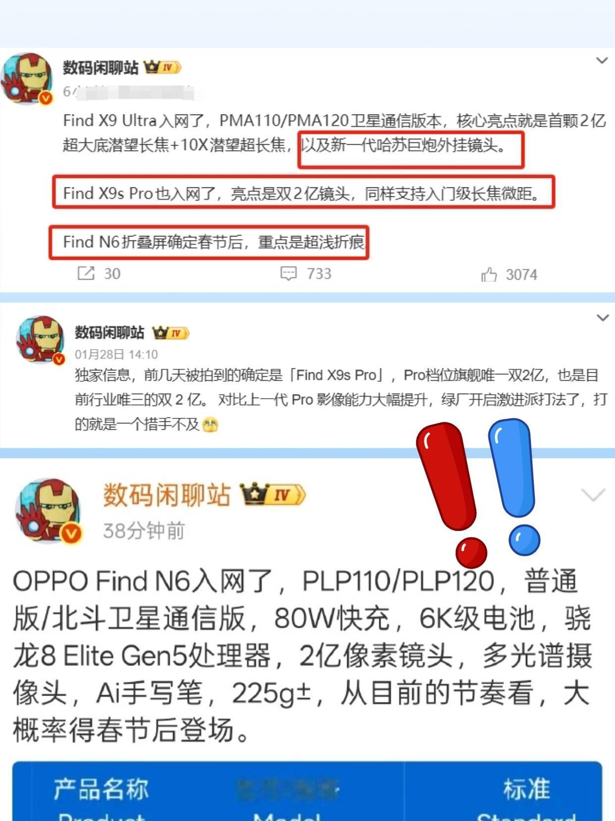 三款重磅新机都已入网,Find X9 Ultra主打首颗2亿超大底潜望长焦+10X潜望超长焦,还会安排上全新的哈苏外设套件,Find X9s Pro主打6.3英寸全能小钢炮,后置双两亿像素镜头,长焦微距也安排上了,2亿像素的微观照片细节很值得期待; Find N6大折叠,在延续上代超轻薄的基础上,重点优化折痕,据说大半年行业都追赶不上