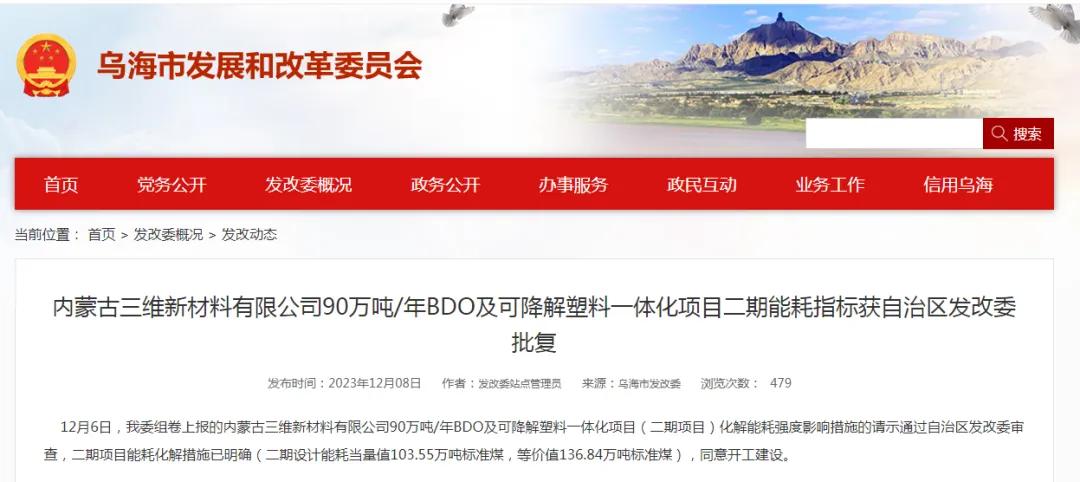 2023年12月8日,乌海市发展和改革委官网公布消息,12月6日,我委组卷上报的内蒙古三维新材料有限公司90万吨/年BDO及可降解塑料一体化项目(二期项目)化解能耗强度影响措施的请示通过自治区发改委审查,二期项目能耗化解措施已明确(二期设计能耗当量值103.55万吨标准煤,等价值136.84万吨标准煤),同意开工建设。