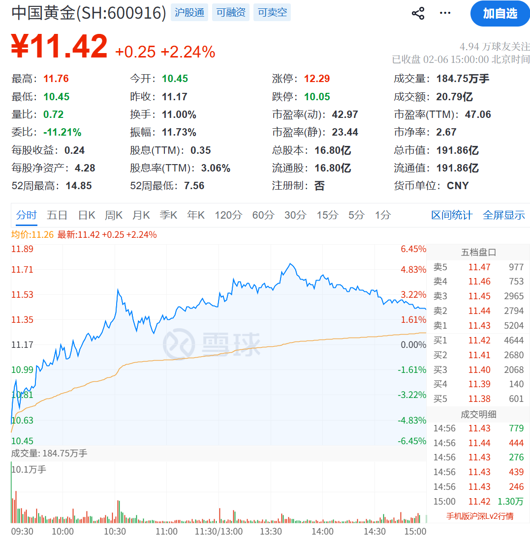 中国黄金于2021年登陆上交所主板市场。截至2月6日收盘,中国黄金报11.42元/股,总市值为191.86亿元。