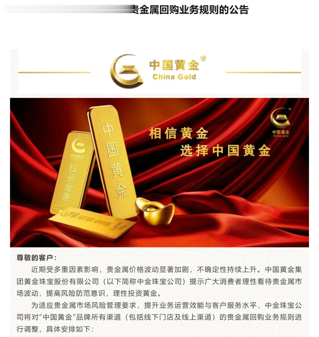 为适应贵金属市场风险管理要求,提升业务运营效能与客户服务水平,公司将对“中国黄金”品牌所有渠道(包括线下门店及线上渠道)的贵金属回购业务规则进行调整,具体安排如下: