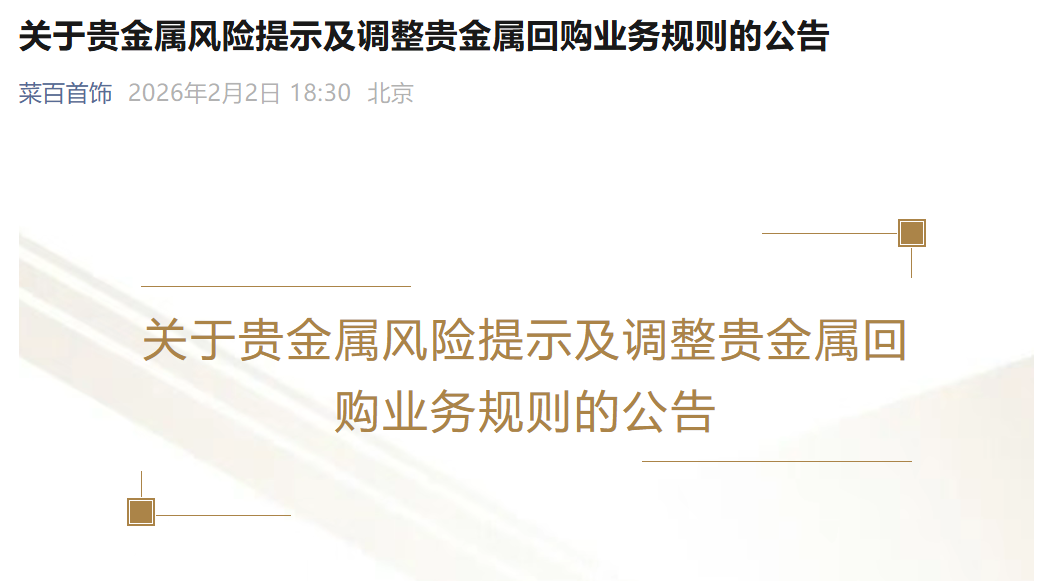 2月2日,菜百首饰发布公告称,自2月6日起,在周六、周日及法定节假日等上海黄金交易所非交易日期间,将暂停办理贵金属回购业务。自2月6日起,在业务办理时间内,菜百将对回购业务进行限额管理,限额类型包括全量或单一客户单日回购上限、单笔回购总量上限等,并进行动态设置。