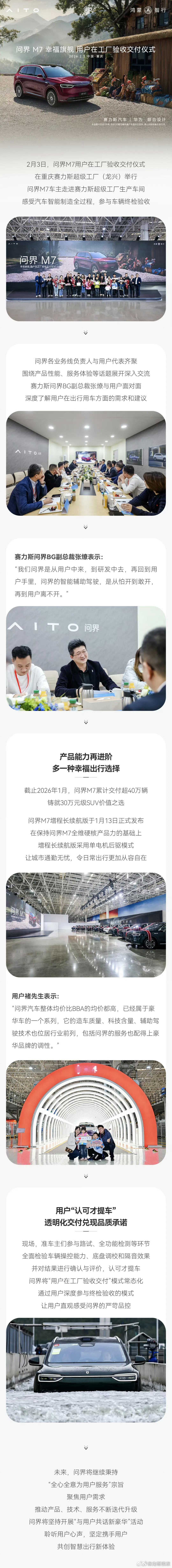 问界M7增程长续航版已经开始交付了!一转眼M7全系交付超过了40万台了!说明什么?说明群众的眼睛是雪亮的!这个长续航性价比最高,CLTC综合续航1690km,纯电续航327km,跨省长途出行无压力。全系标配乾崑ADS 4.0智驾系统,支持无图城市导航;鸿蒙座舱+途灵底盘兼顾智能与舒适……好产品是经得起历史和人民检验的!
