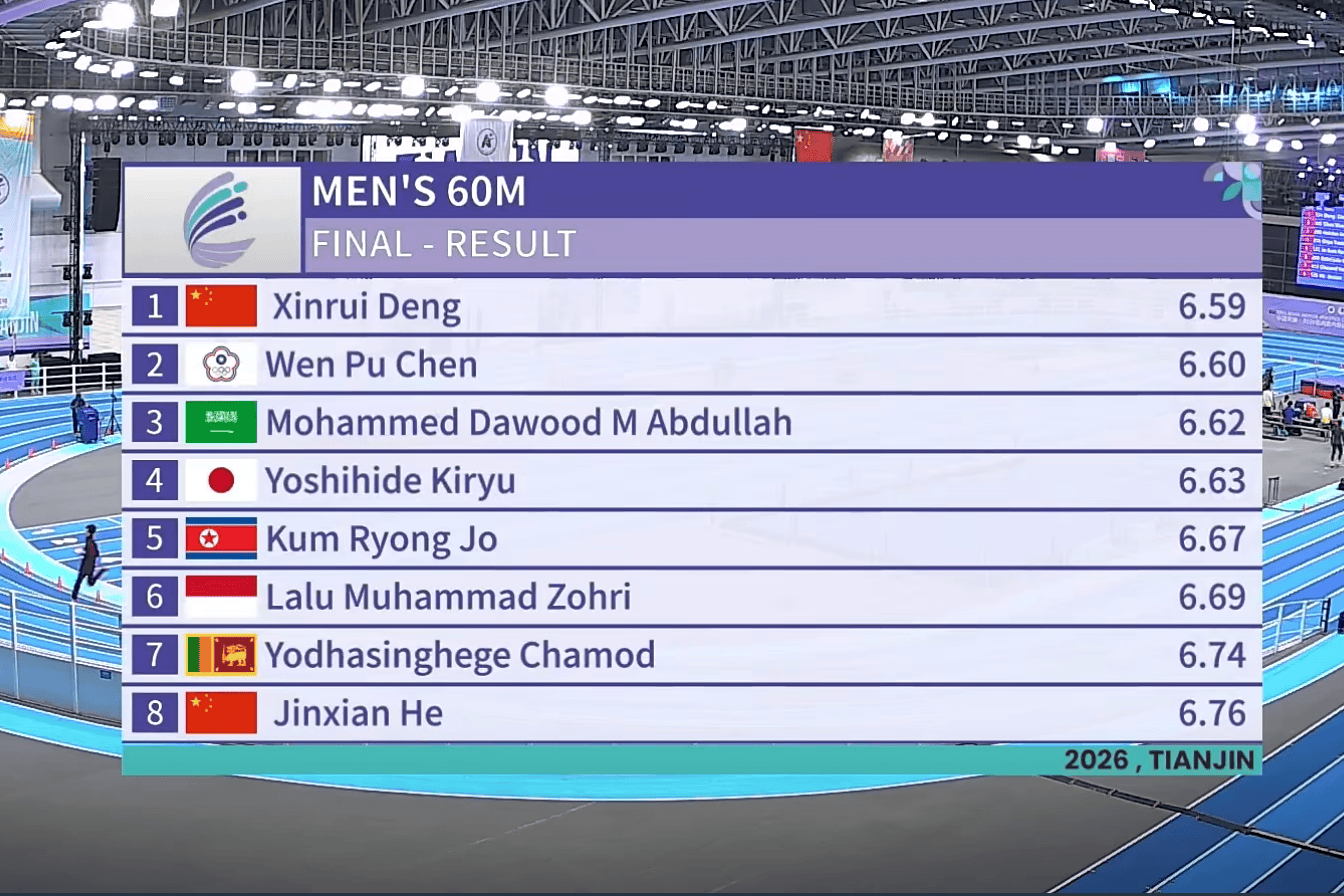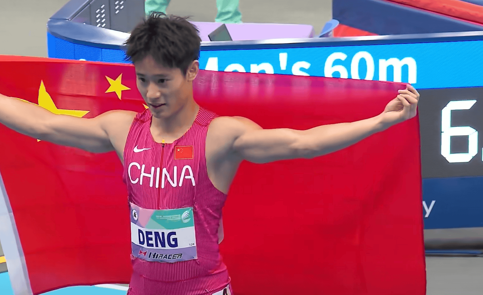 虎扑02月06日讯2026年亚洲室内田径锦标赛首日收官之战男子60米决赛刚刚结束,中国选手邓信锐出发后便一马当先,最终以6秒59率先冲线,夺得冠军。